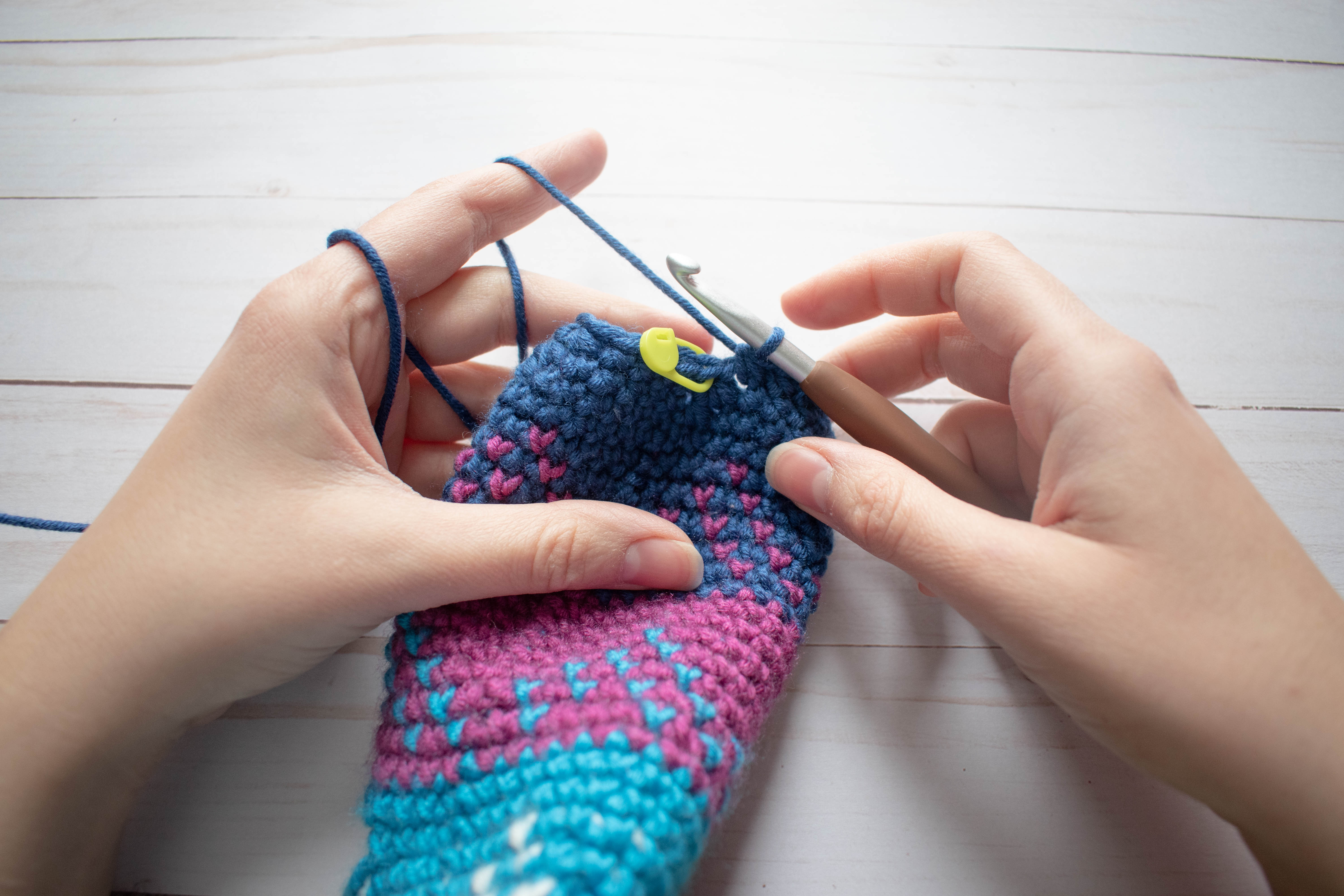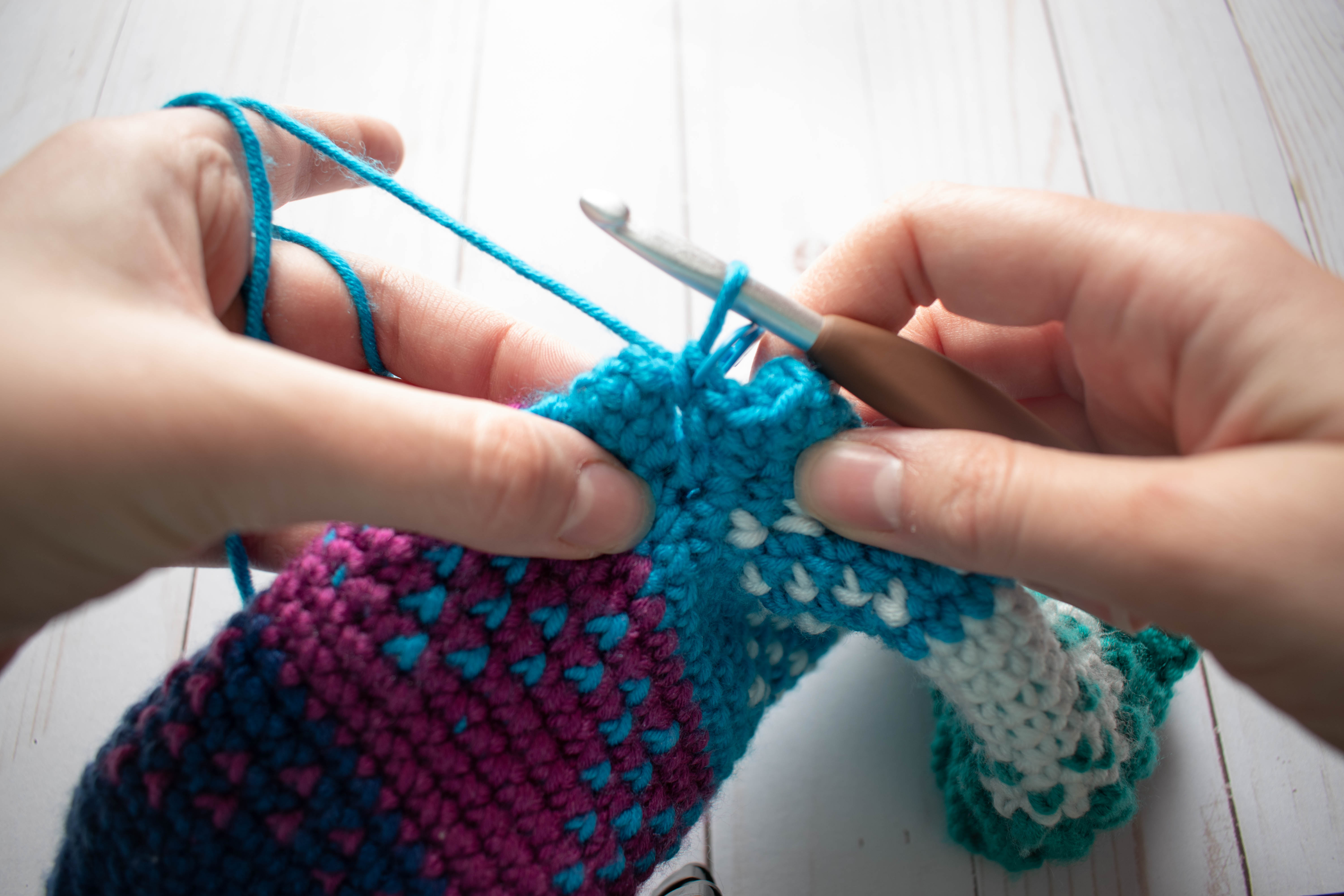 From here, you will crochet a few more rounds in the third color, working a few decreases as you go. Once the rounds reach the height of when the 4th color comes in of the palm of the mitten, you will switch to the fourth color in the thumb.