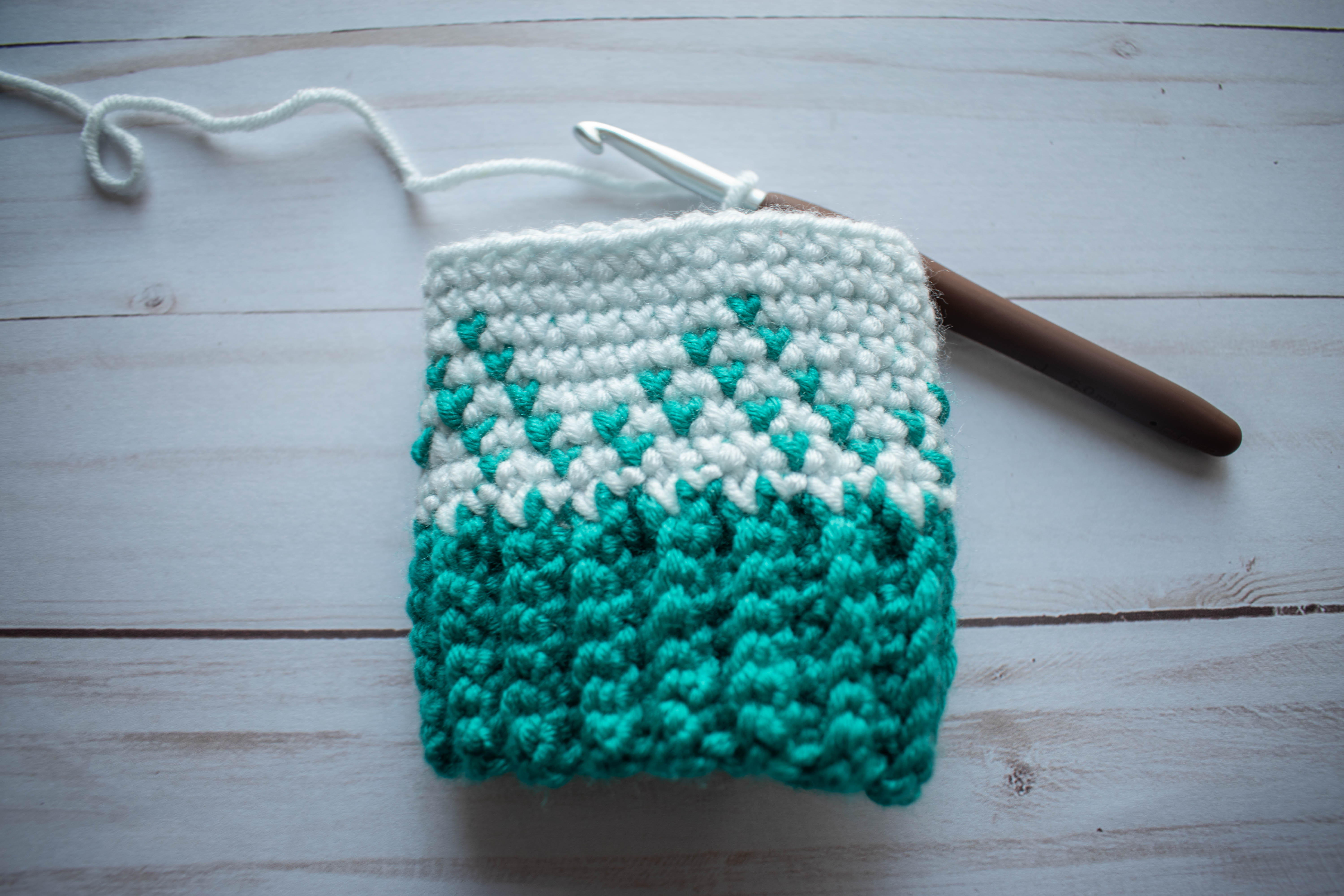 To work the color changes you will insert your hook into the color change stitch, pull up a loop in secondary color, yarn over in primary color, and pull through both loops on your hook.