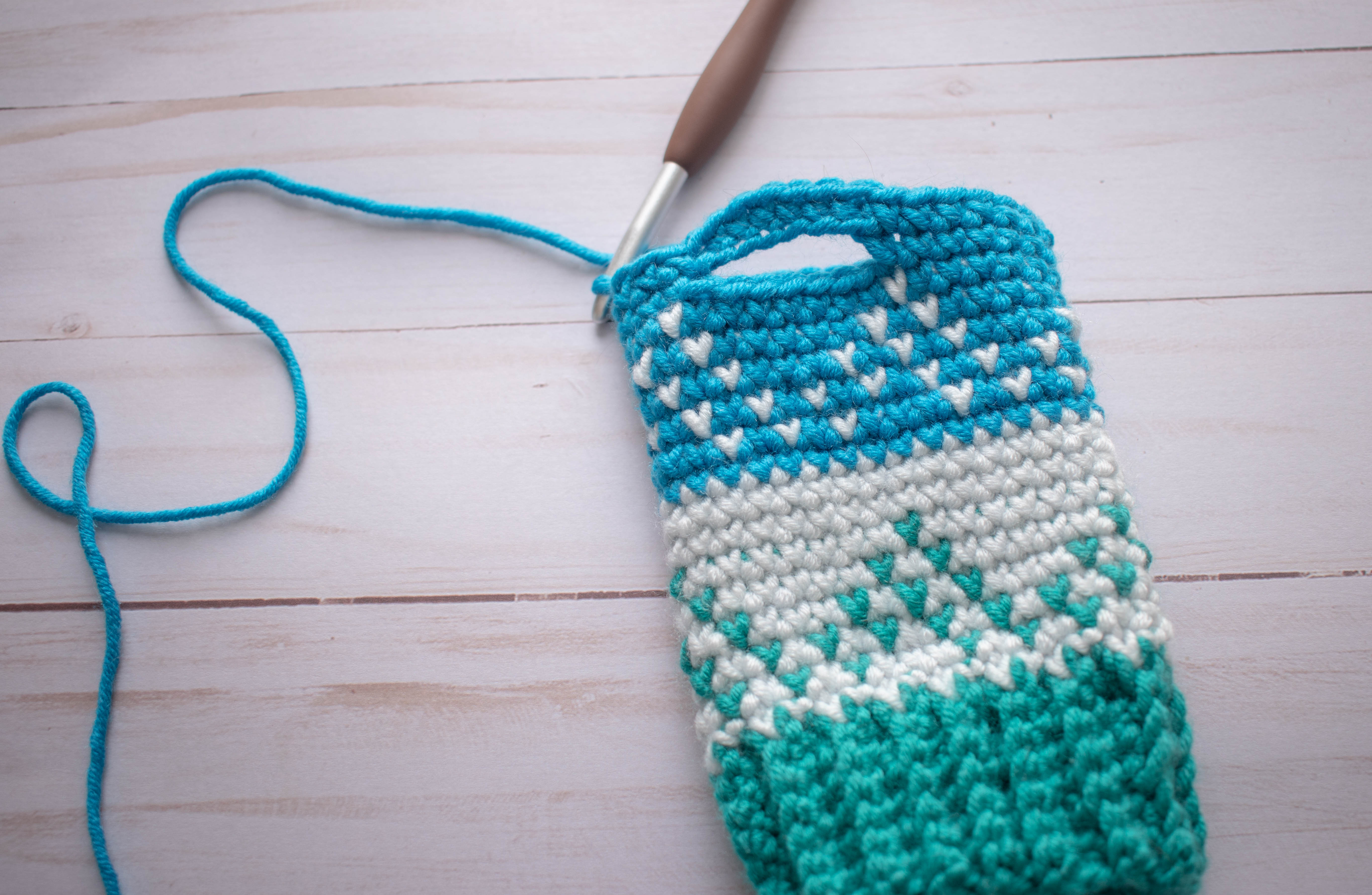 To do this, you will insert your hook into the back loop of the last row to a the corresponding stitch of the foundation, yarn over and then pull that loop through all three loops on your hook. Continue doing this all the way up and then you will pick up the second color yarn.