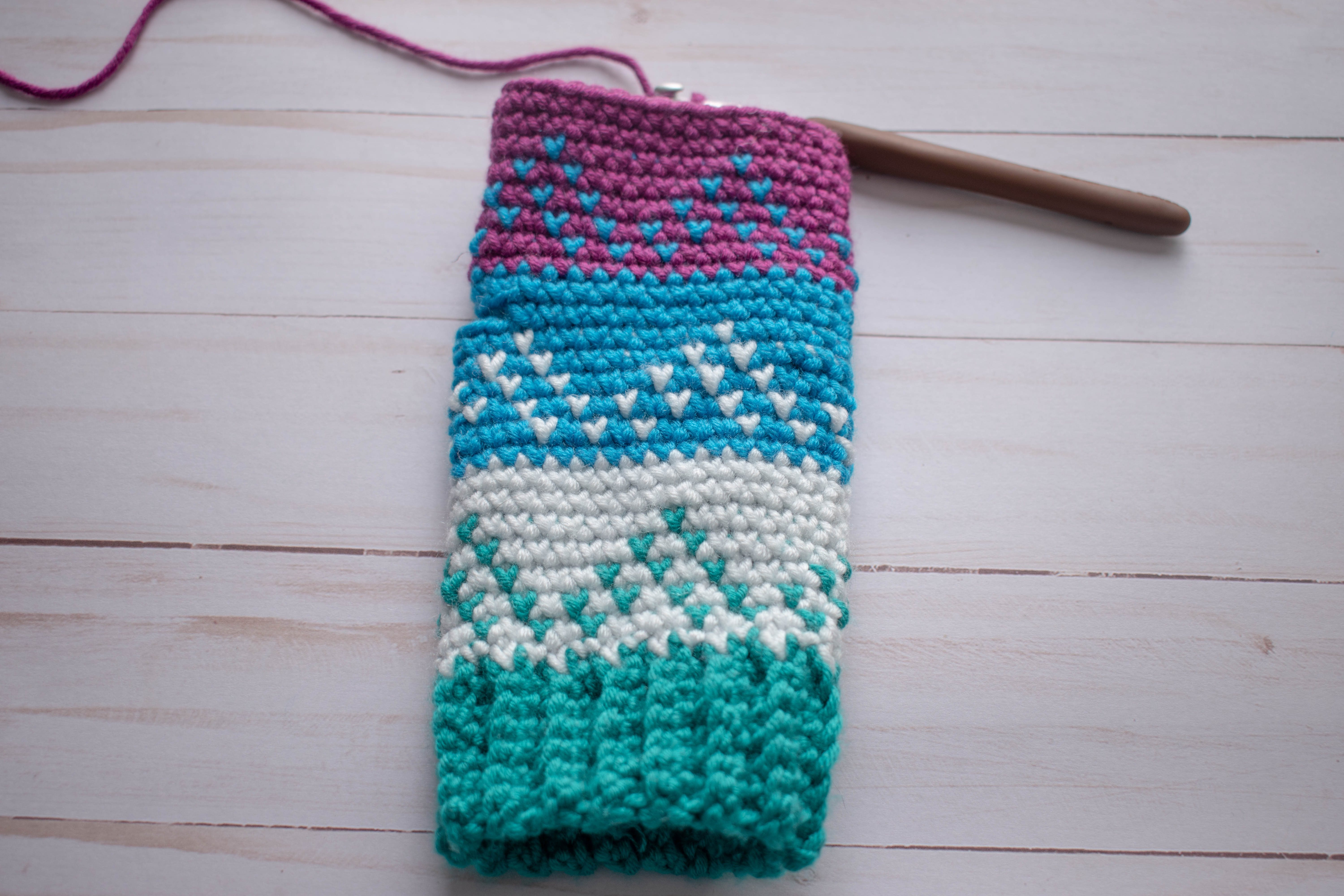 From here, you will crochet a few more rounds in the third color, working a few decreases as you go. Once the rounds reach the height of when the 4th color comes in of the palm of the mitten, you will switch to the fourth color in the thumb.