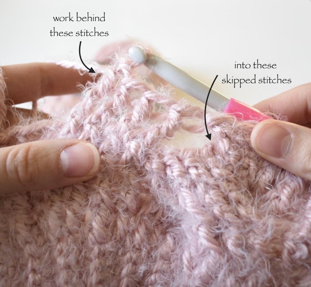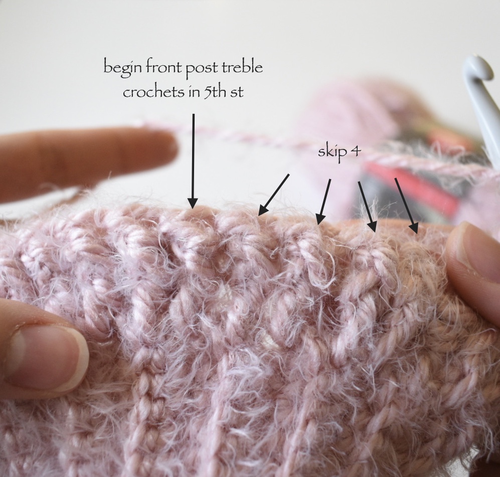 You will then go back and work 4 more treble crochets into the stitches you just skipped. These stitches will be worked in front of the first 4 front post treble crochets.
