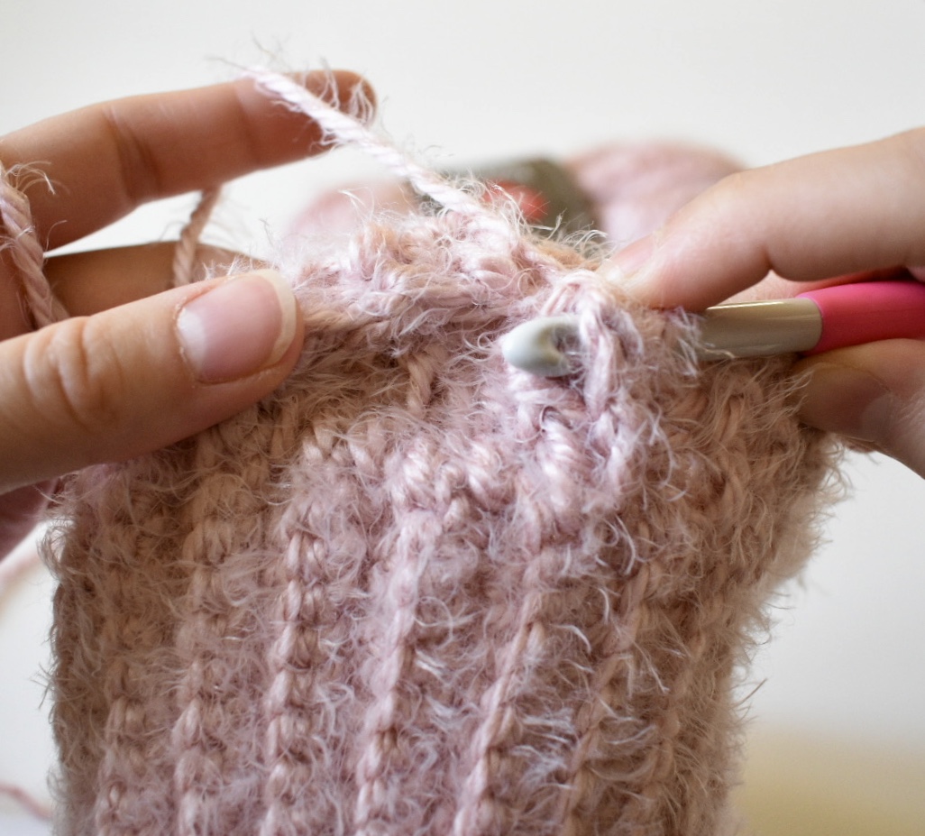 Once the foundation of 65 double crochets has been laid, you will work a round of front post and back post double crochets. These will work as the foundation of the cabling.
