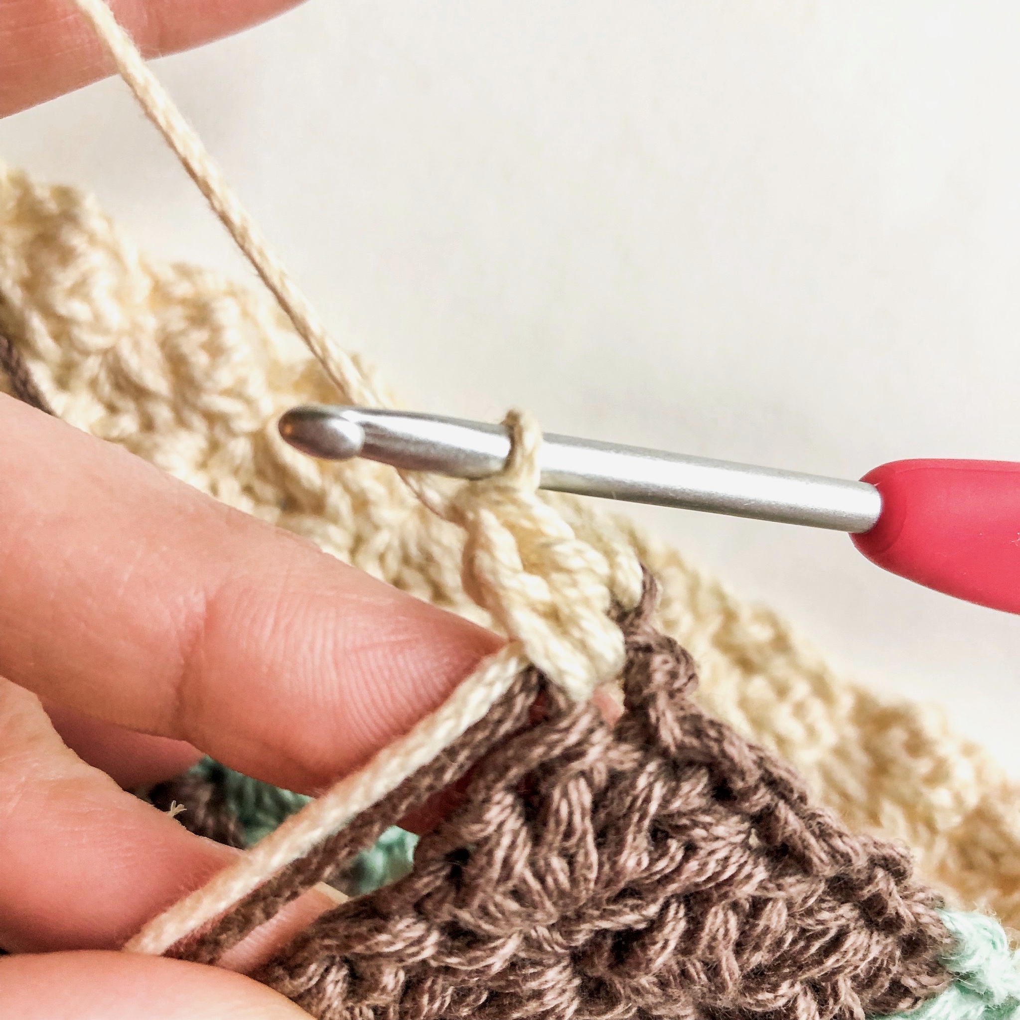 Typically multiple color changes also means multiple ends to weave in at the end. However, I like to weave in ends as I go. Meaning, when you end with one color and start another, you will pull up your new color as the turning chain and then take the end of the row prior and carry it into the first few stitches of the new colored row.