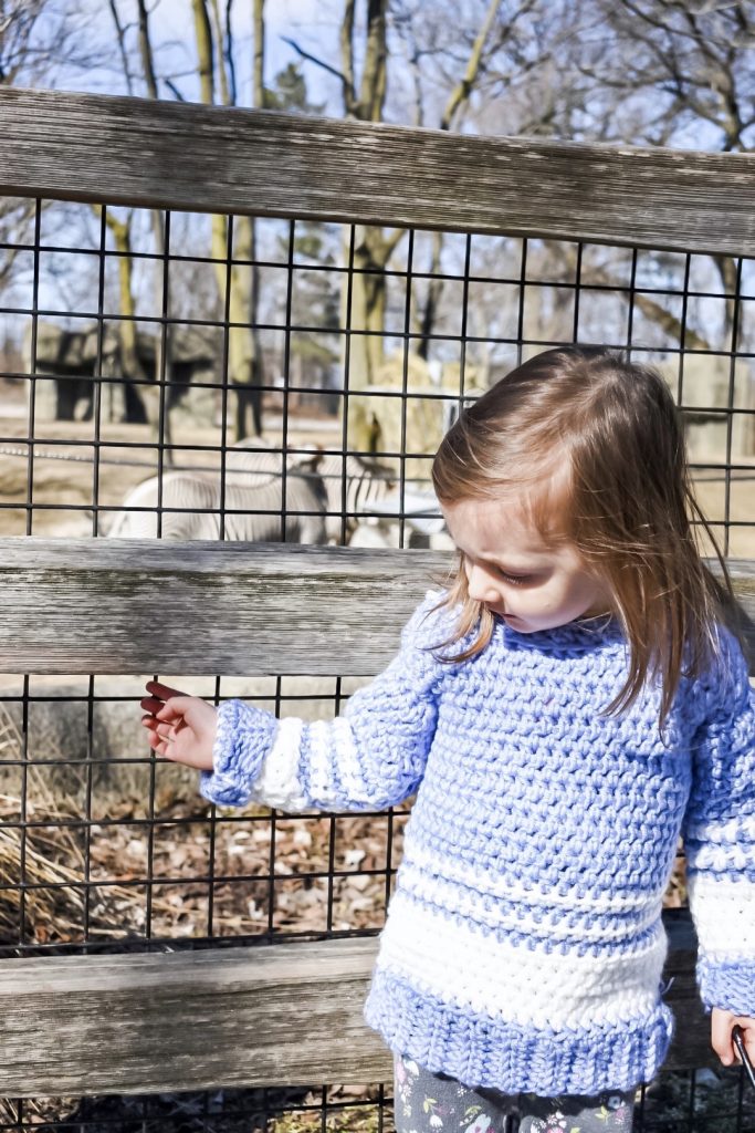 This sweater is no different. I had so much fun making the Easy Crochet Pullover for myself, and the whole time I was working on it, Audrey kept asking if it was for her. When I saw this periwinkle Color Made Easy yarn, I knew I just had to make a matching sweater for her.