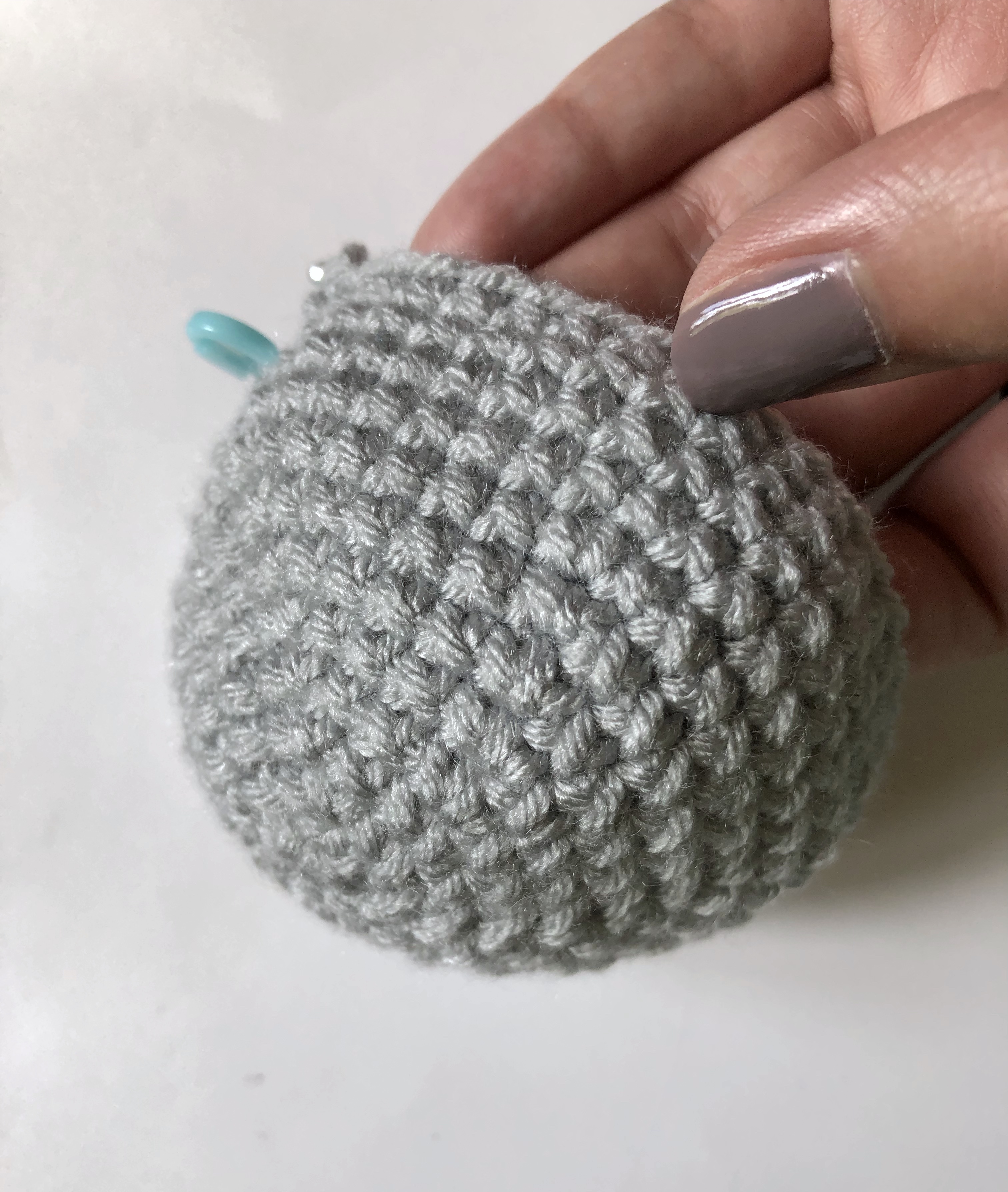 Before decreasing too much, you will want to add on your elephant’s face. I placed 2 safety eyes on either side of the opening, making sure that my starting stitch was located at the bottom center. This is important for when you begin to work your trunk, so make sure you are using a stitch marker to identify this stitch.
