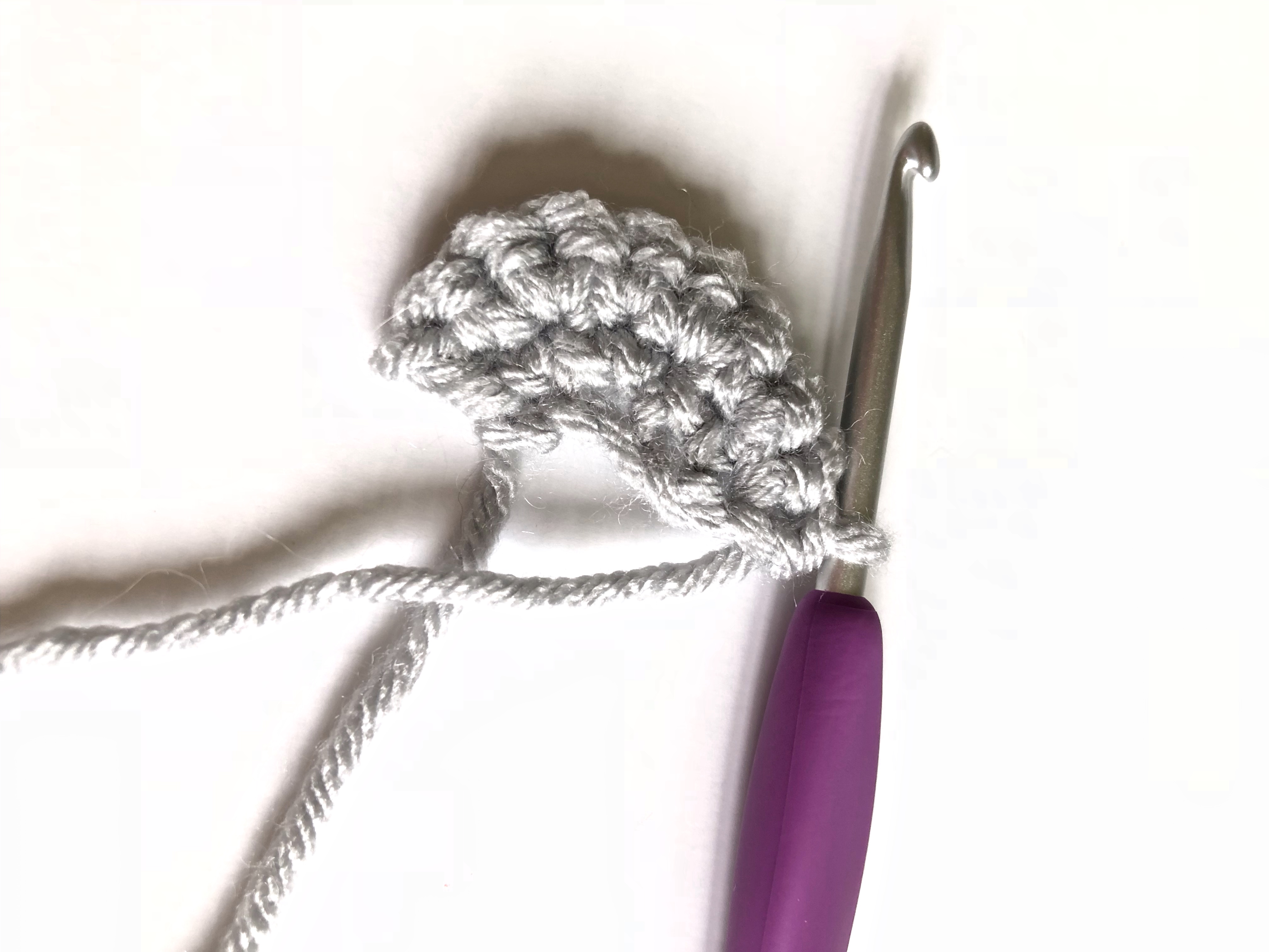 Now that the head is complete, you will move on to making the ears. The ears are just two half circles, and are incredibly easy to work up. You will start out with a short foundation row, and slightly increase in each subsequent row. You will be turning your work as you go, as opposed to working in the round like you did with the head.