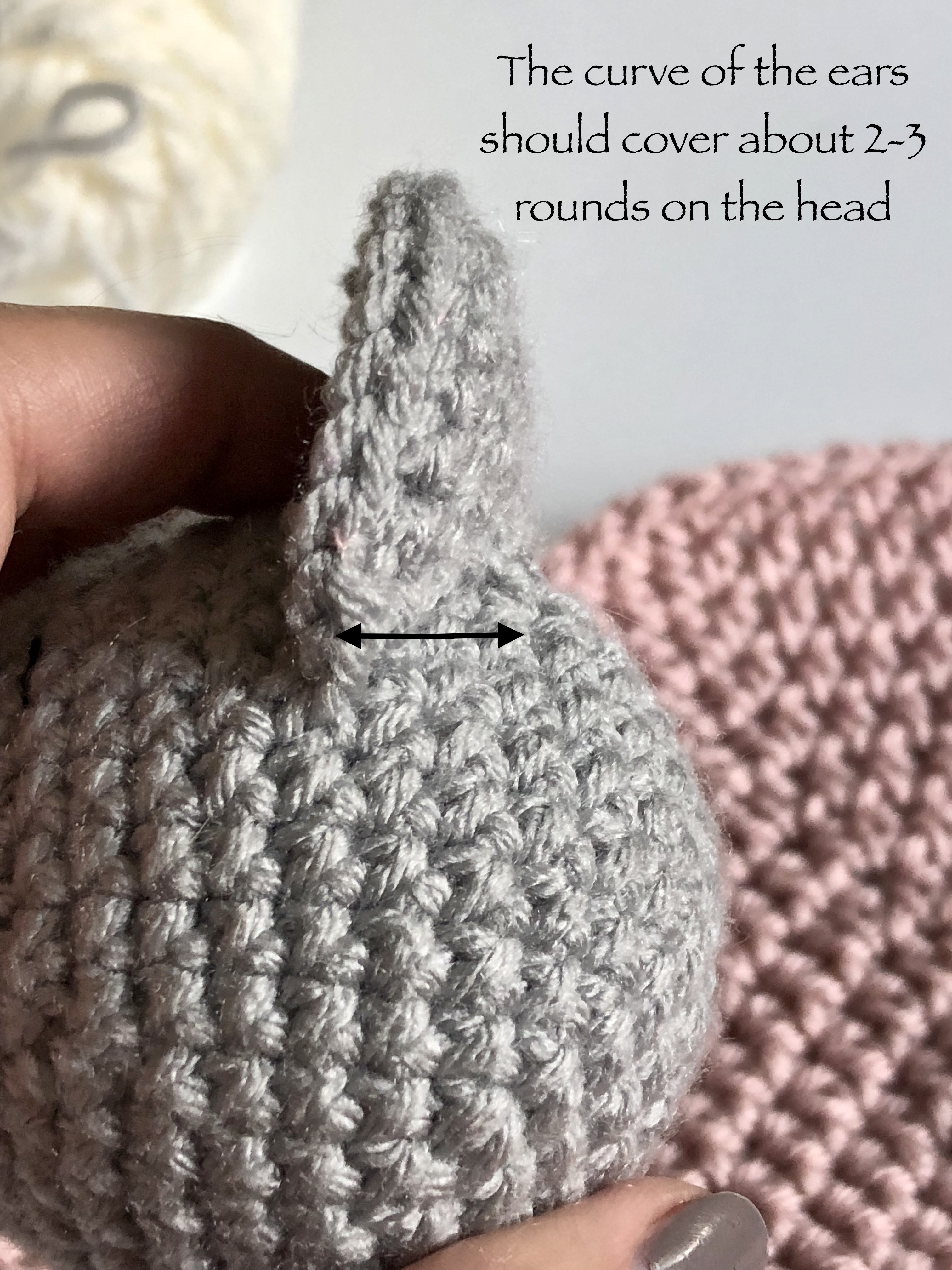 I attached the top of the ears between rounds 9 & 10 of the head. Then brought the middle of the ears back so that they attached between rounds 7 & 8 in the middle. The bottom of the ears should end up back between rounds 9 & 10.