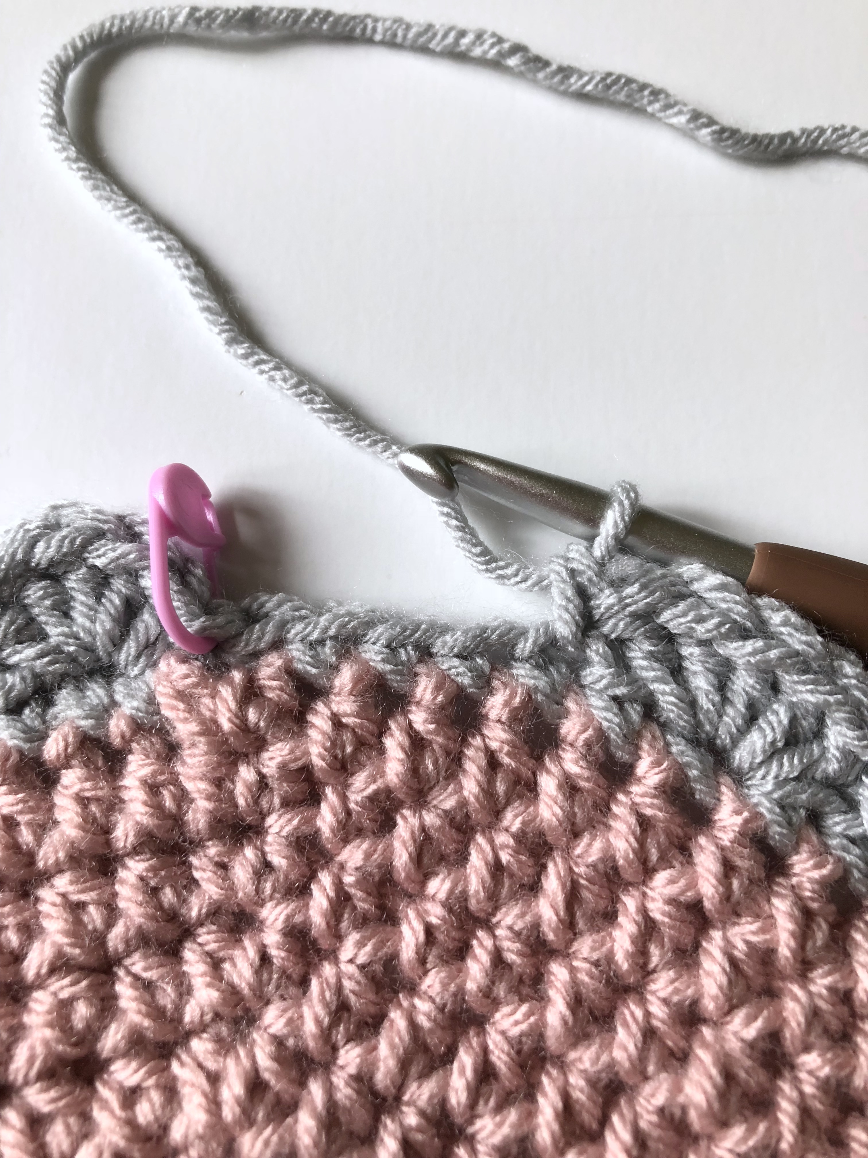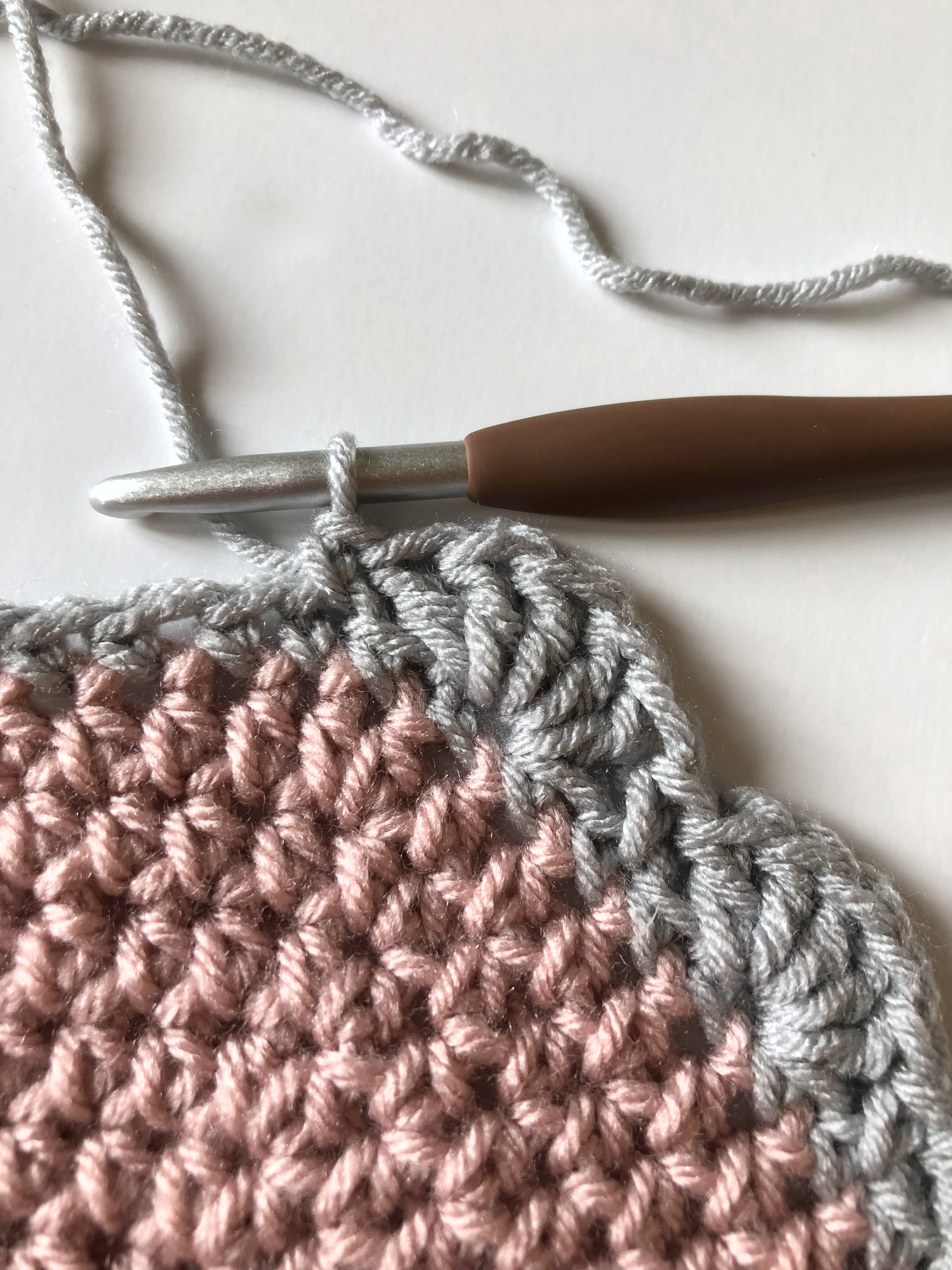 To complete the blanket, you will be adding a shell border. I chose to work my shell border in the gray I used for the head, so I worked a round of single crochets in gray before making the shells.