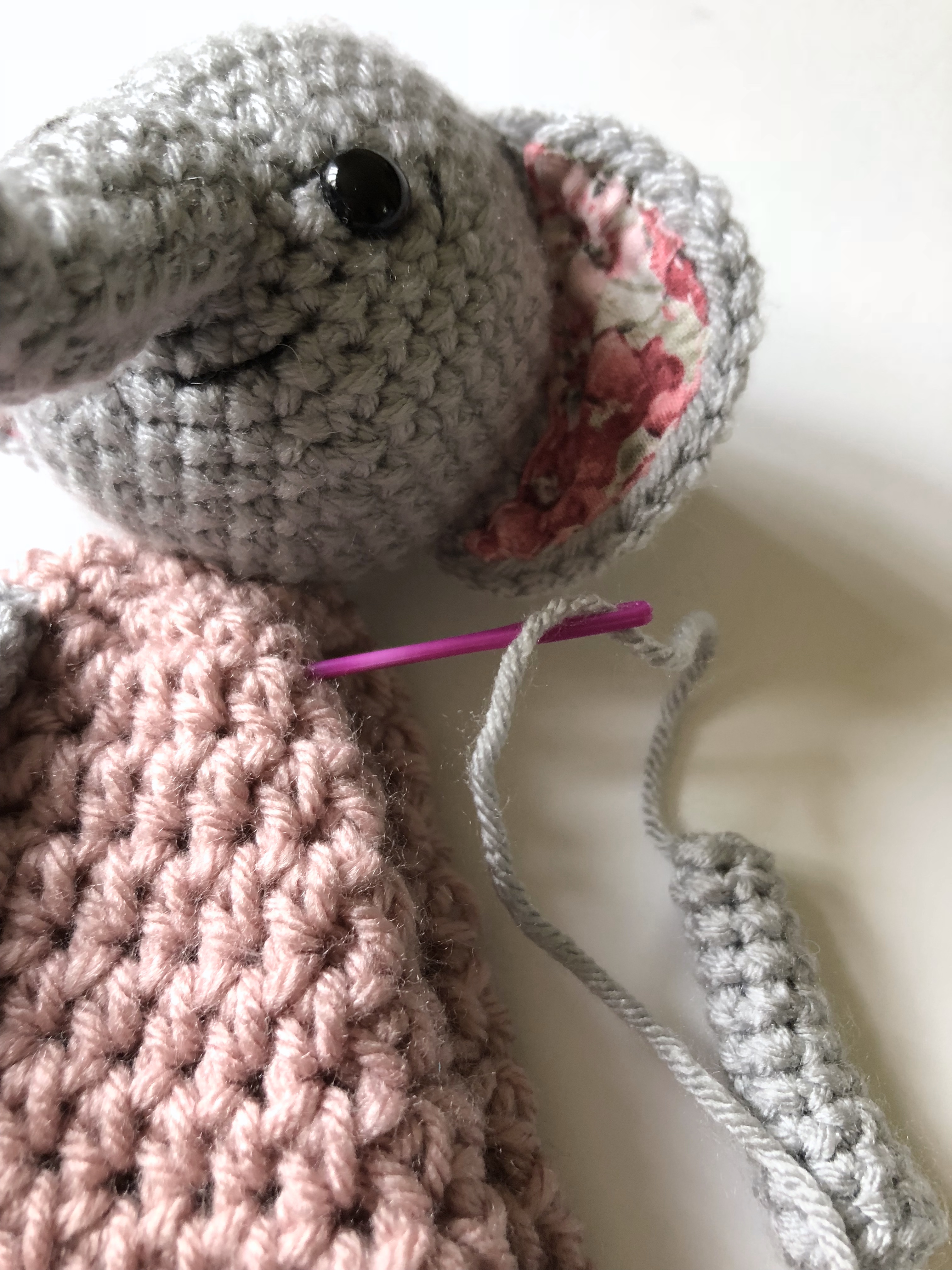 Using the tails of the ears, or an extra piece of yarn, attach the ears to the head. I attached my elephant’s ears on a curve, so that the top of the ears were between rounds 9 & 10 of the head, the middle between rounds 7 & 8 and the bottoms between 9 & 10 again. Once the ears are secured in place, fasten off and weave in the ends.