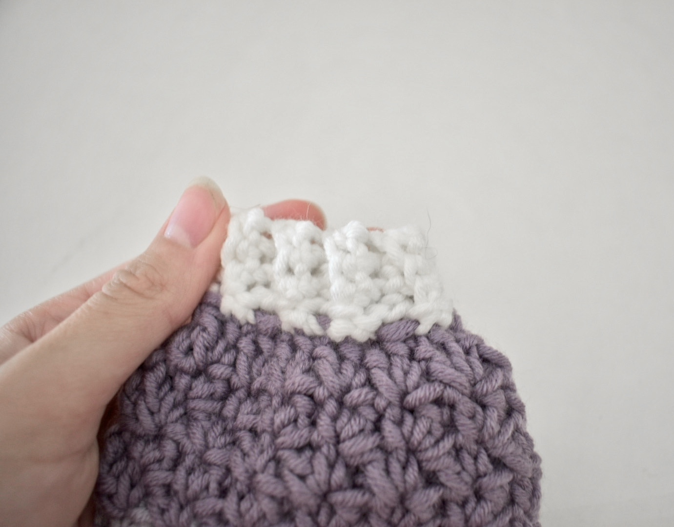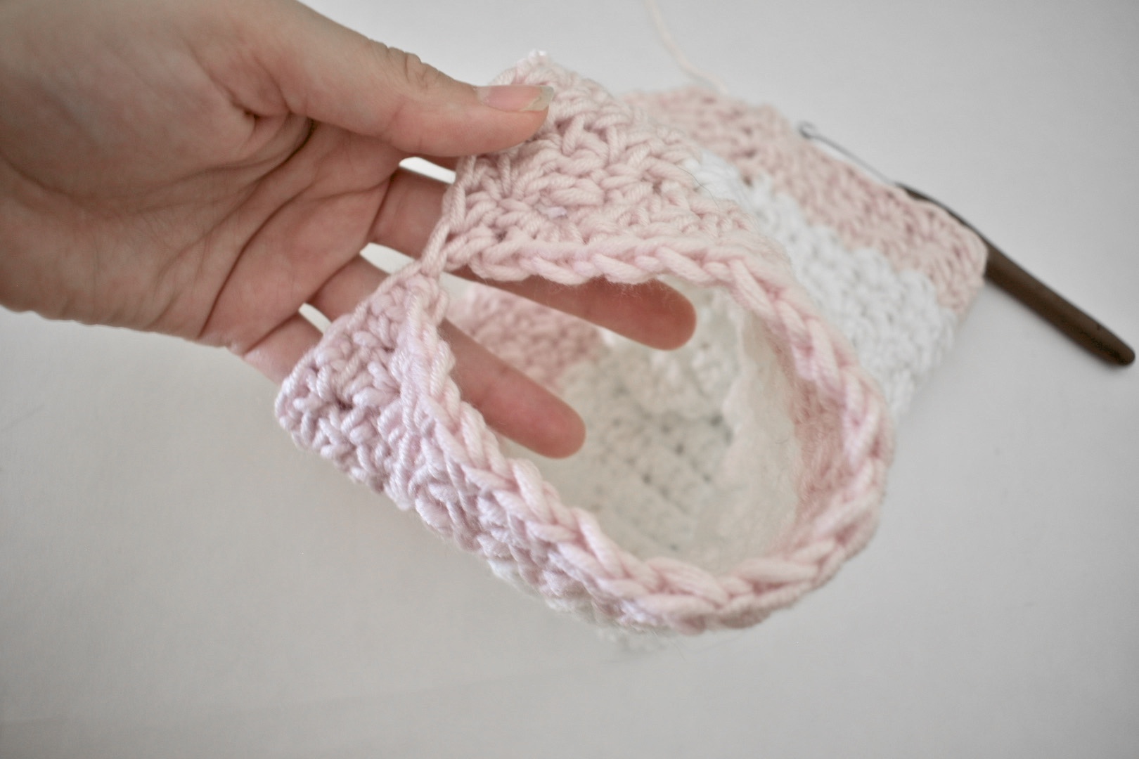 Once the needed length has been achieved for the size you are making, you will add a few rows of ribbing to the bottom. I use a technique of adding the ribbing as I go, but you could certainly work the ribbing separately and fasten it to the bottom later if you prefer. If you choose to follow the pattern of adding the ribbing as you go, I highly recommend checking out this helpful video tutorial by Toni of TL Yarn Crafts before you start.