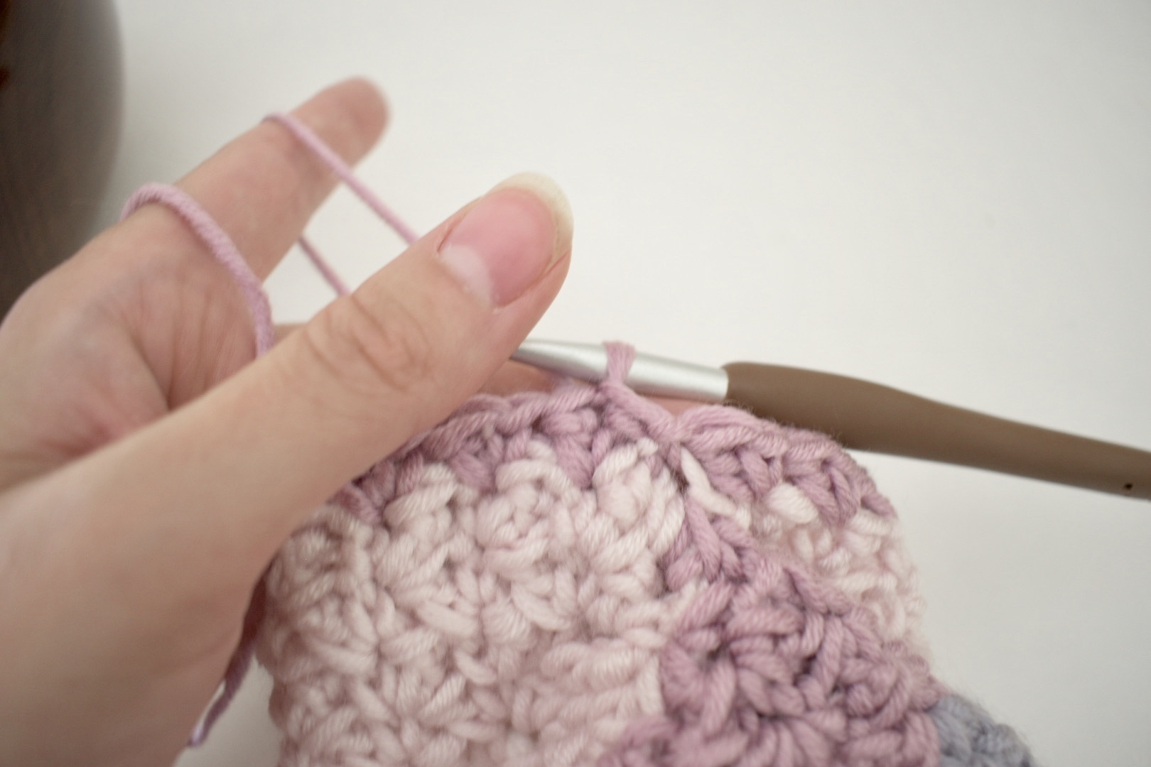 Thanks so much Bev! I used Caron X Pantone Yarn in Ultra Violet Minerals (purple sample) and River Rock (taupe sample). Hope this helps and happy crocheting!