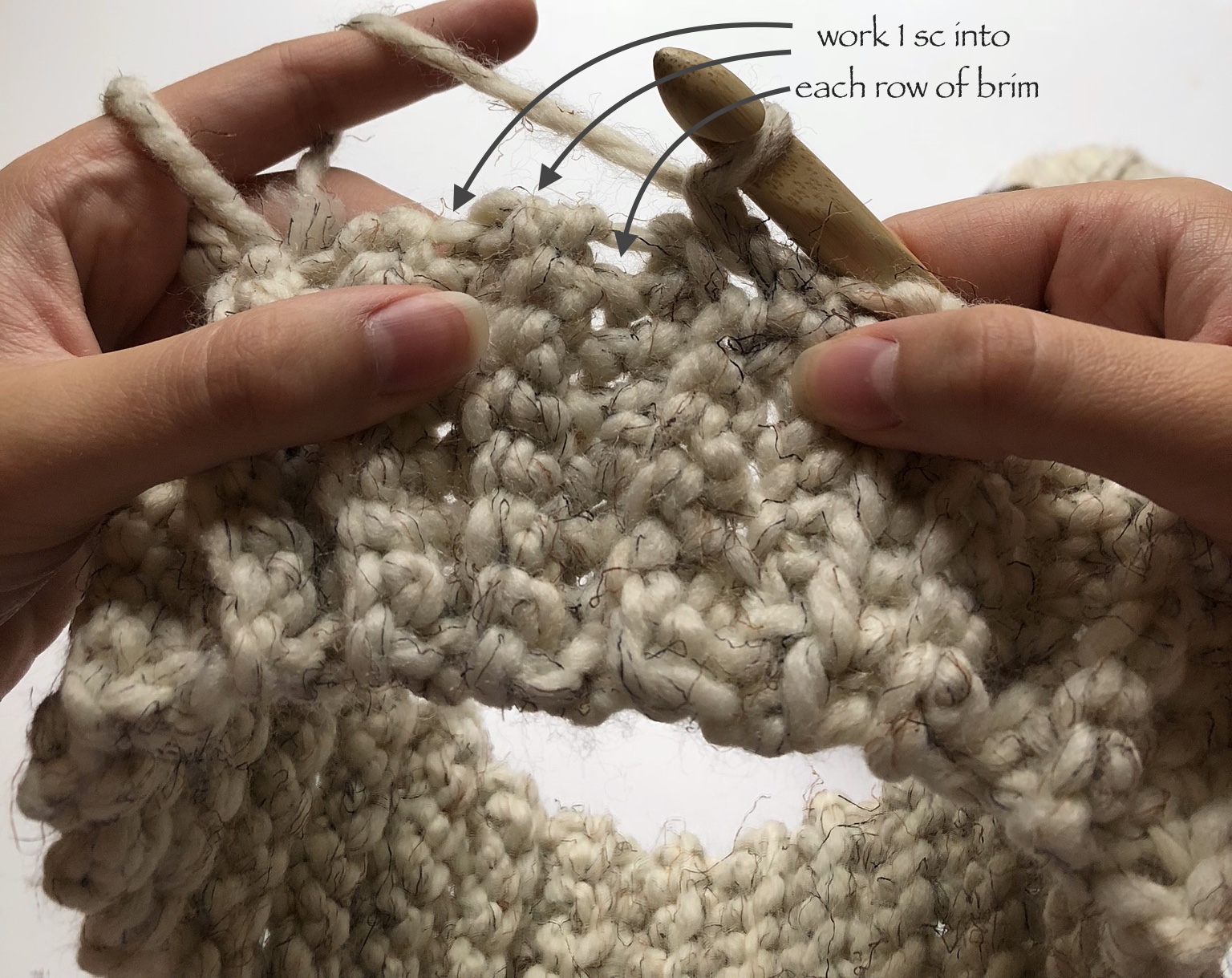 Once your brim is complete, you will begin to pull up single crochets around the top.  You will do this by reattaching your yarn to the remainder of the tail left from the ribbing.  Each row from the ribbing will have a single crochet worked into it.