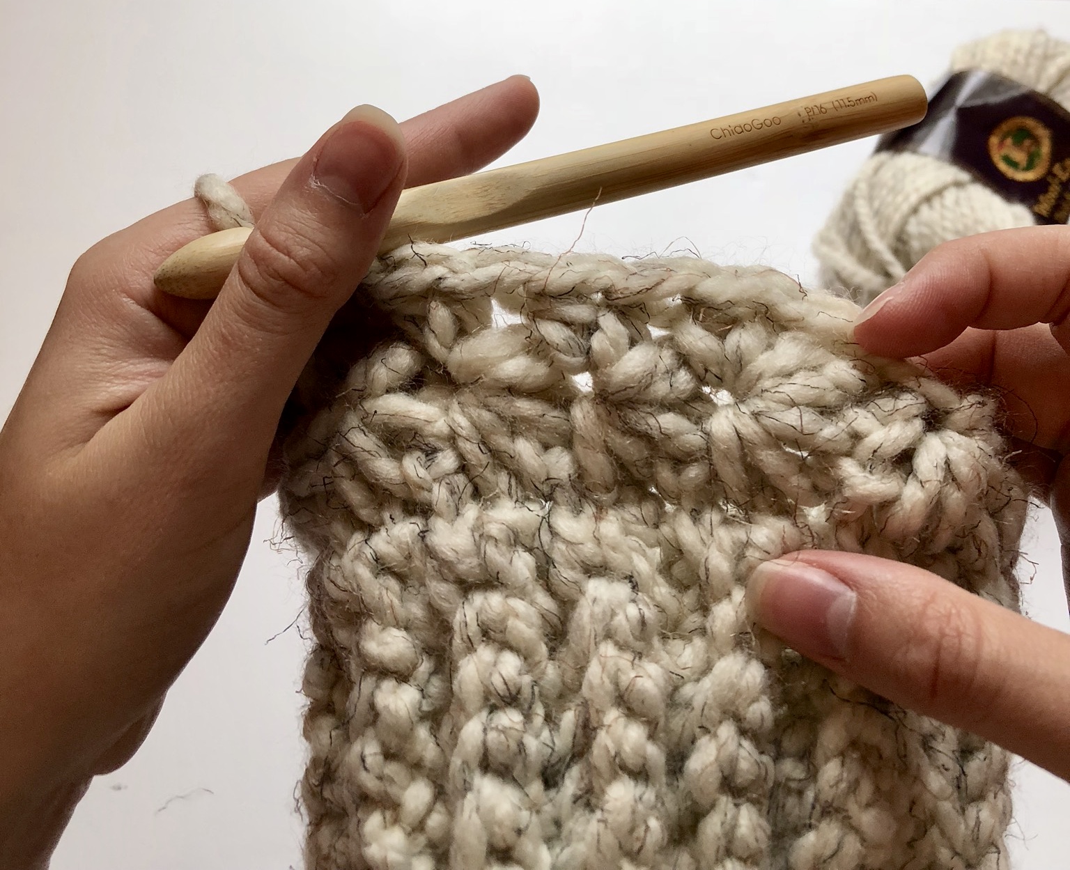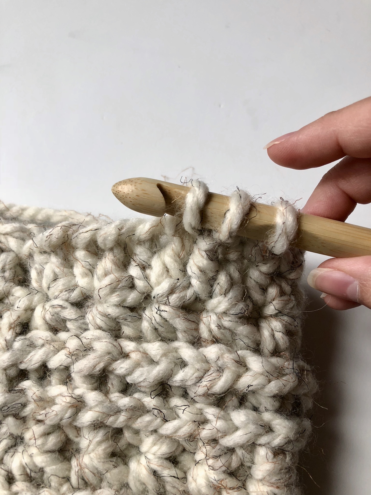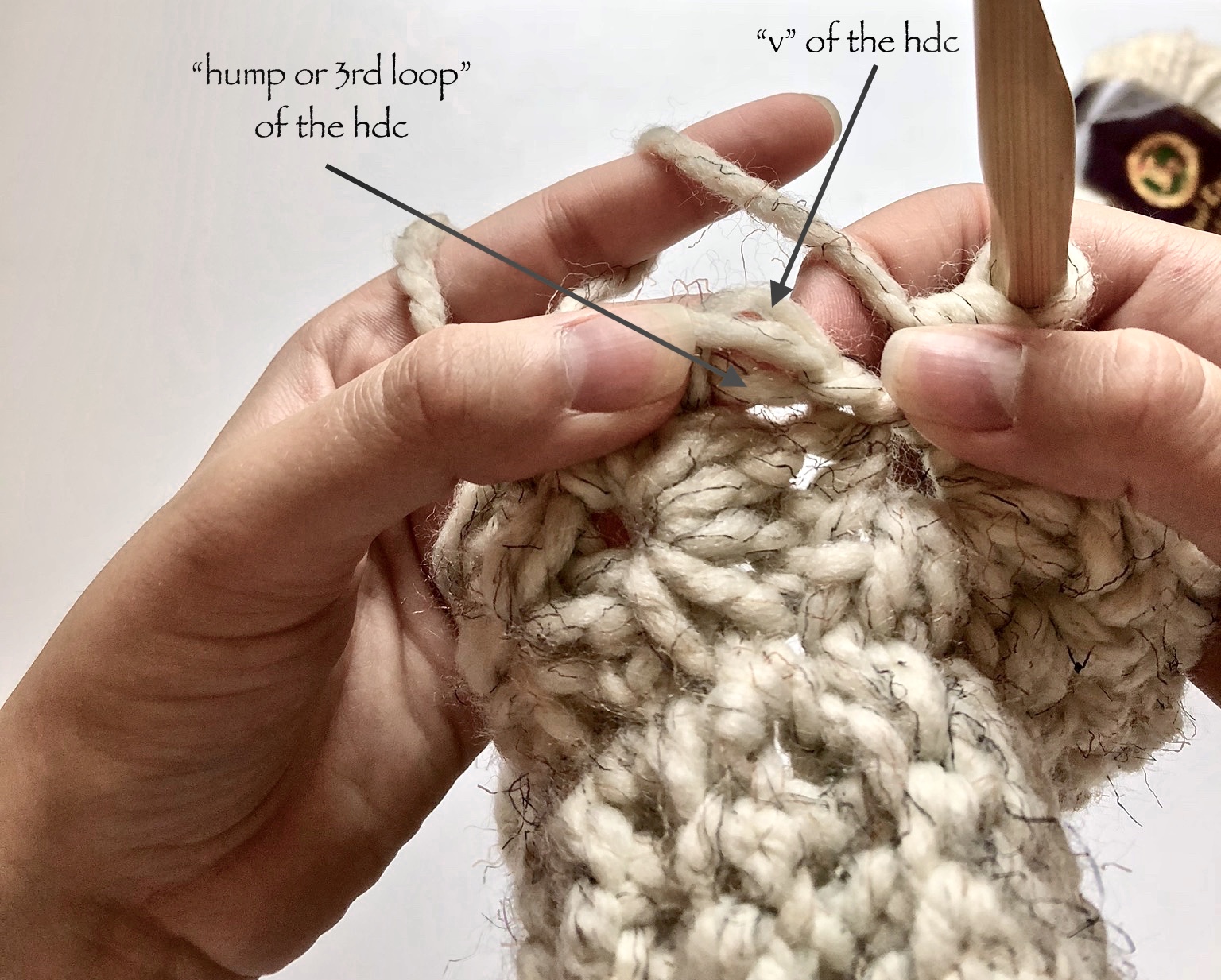 So when working a half double crochet, you first yarn over and then essentially work a single crochet stitch to complete, just pulling through 3 loops instead of 2.  That initial yarn over is what creates this “hump”.  In order to find it, all you need to do is first locate the “v”, then below and behind it you will see that 3rd loop.