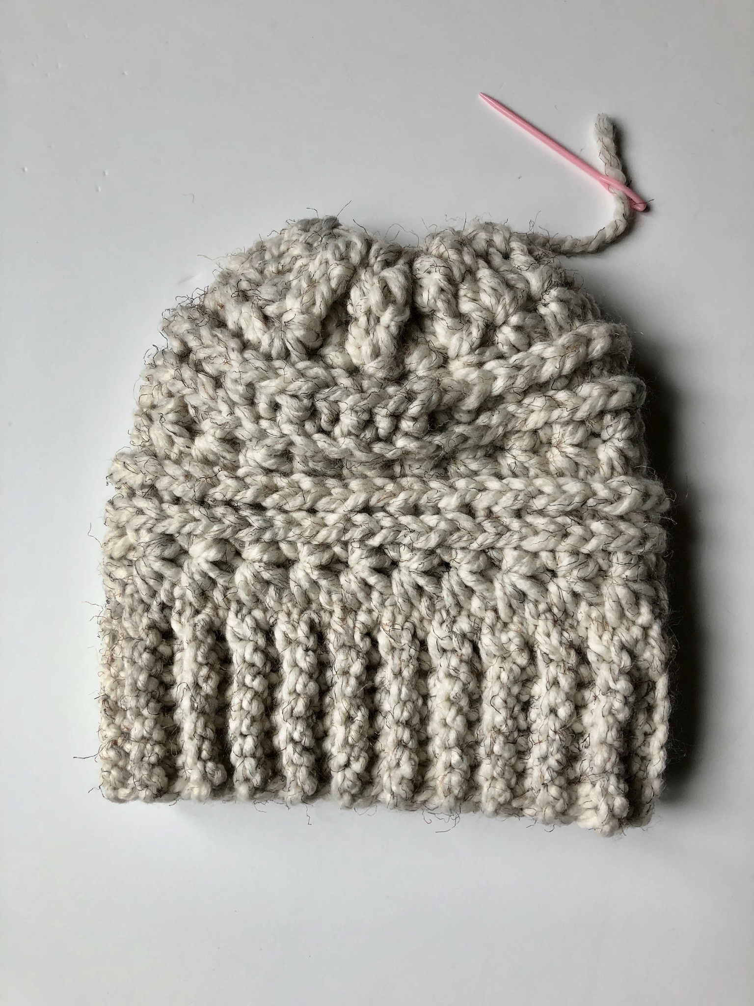fullsizeoutput_1925The camel stitch is the 3rd type of stitch used for this beanie.  It gets its name because you will be working into the 3rd loop or “hump” of your half double crochet stitches (instead of working into the top “v”).
