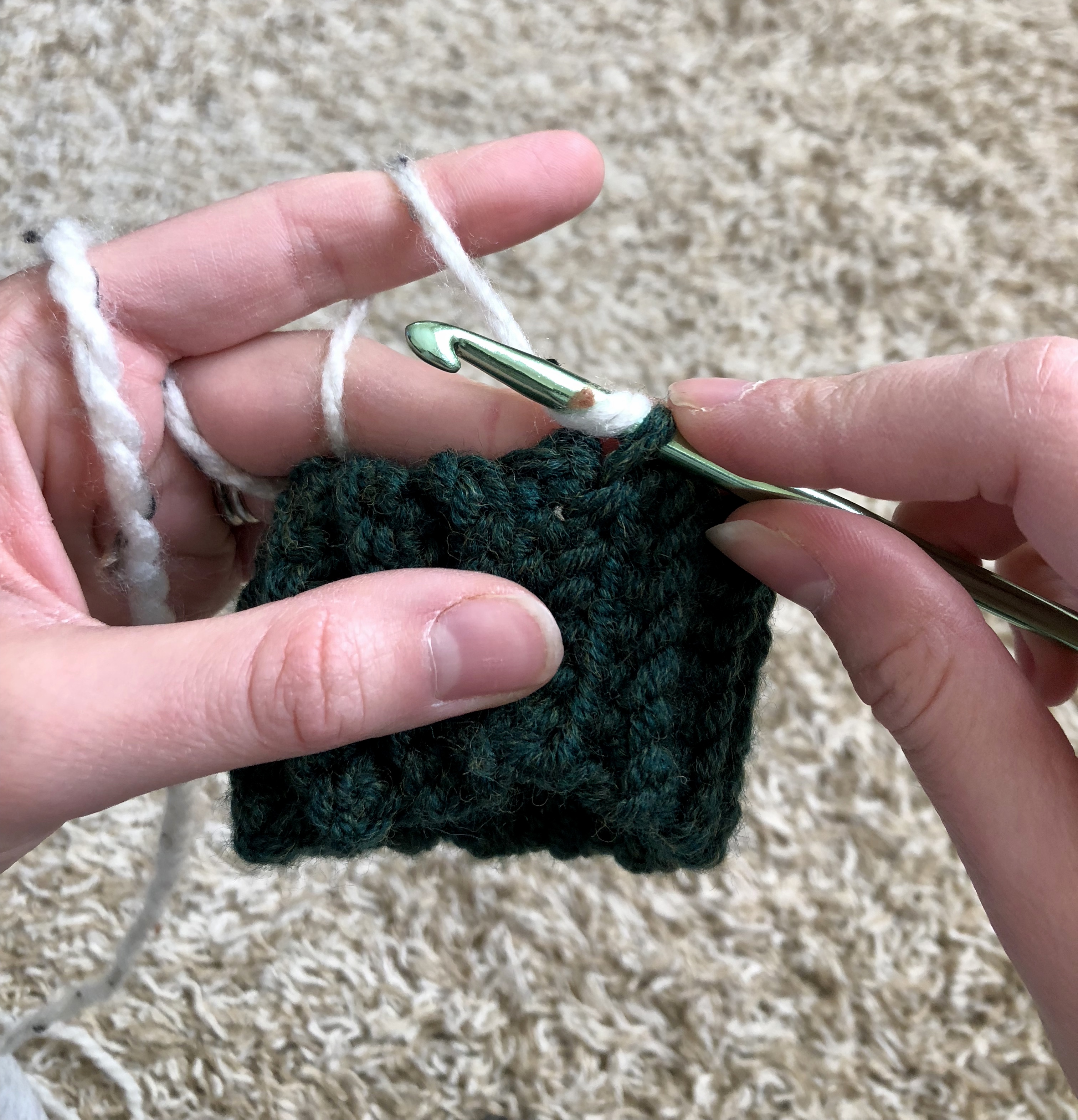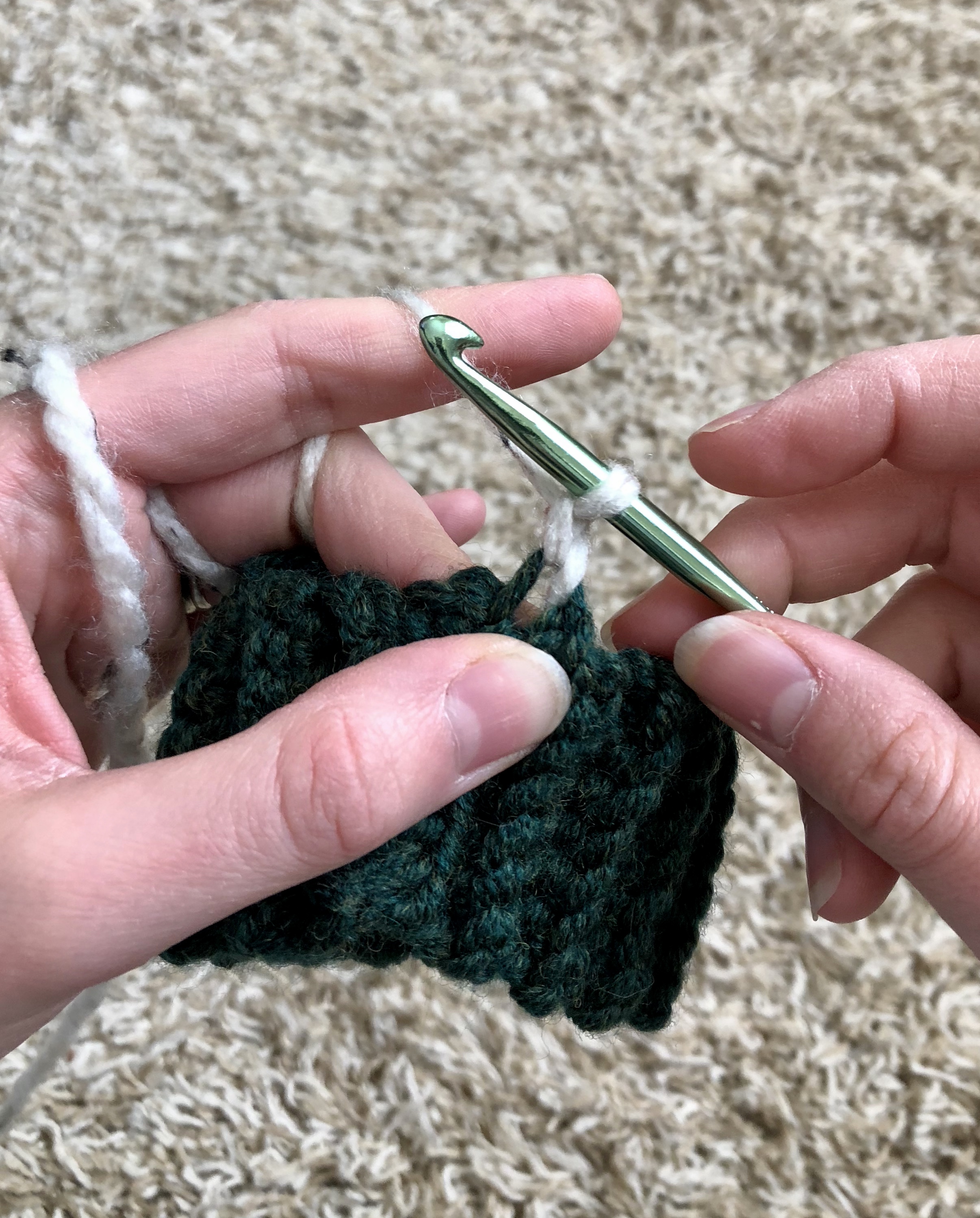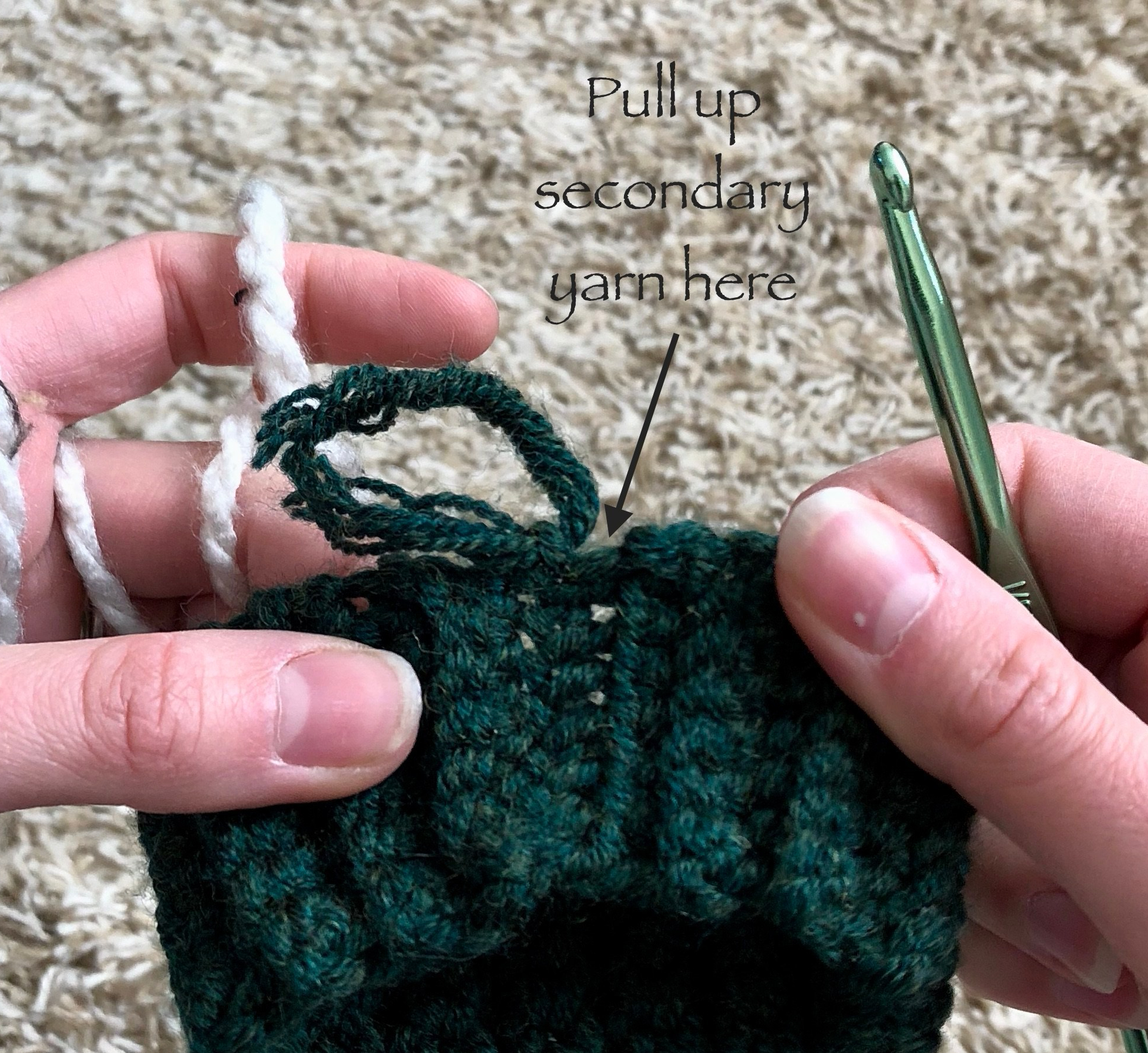 When switching between the colors you will actually begin switching in the stitch proceeding the stitch you want to be a different color. For example, in the Right Handed Graph above for round 4, you will single crochet 2 normally then in your third single crochet you will begin switching to your primary color, and in the next stitch you will begin switching back to your secondary color because only one stitch is completed in your primary. Follow? So to do this, you will start your stitch normally but before your final yarn over and pull up, you will yarn over in your primary color and pull that through the two loops on your hook.