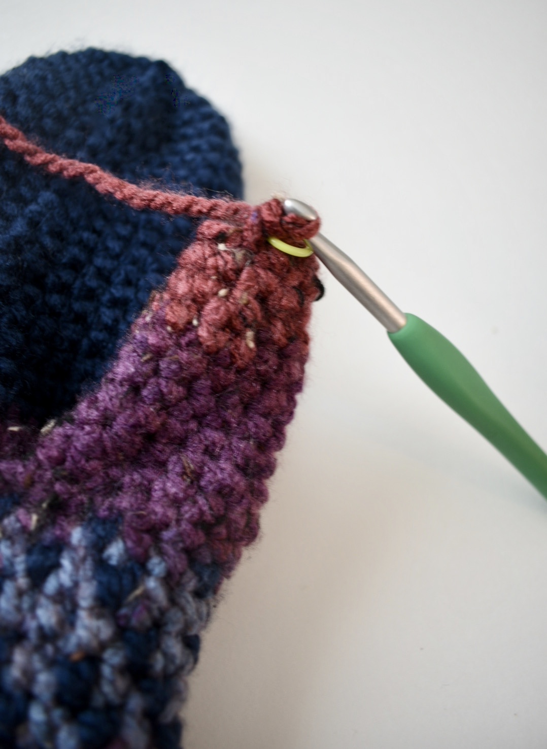 The thumb is worked in continuous rounds, so get out your stitch marker here.