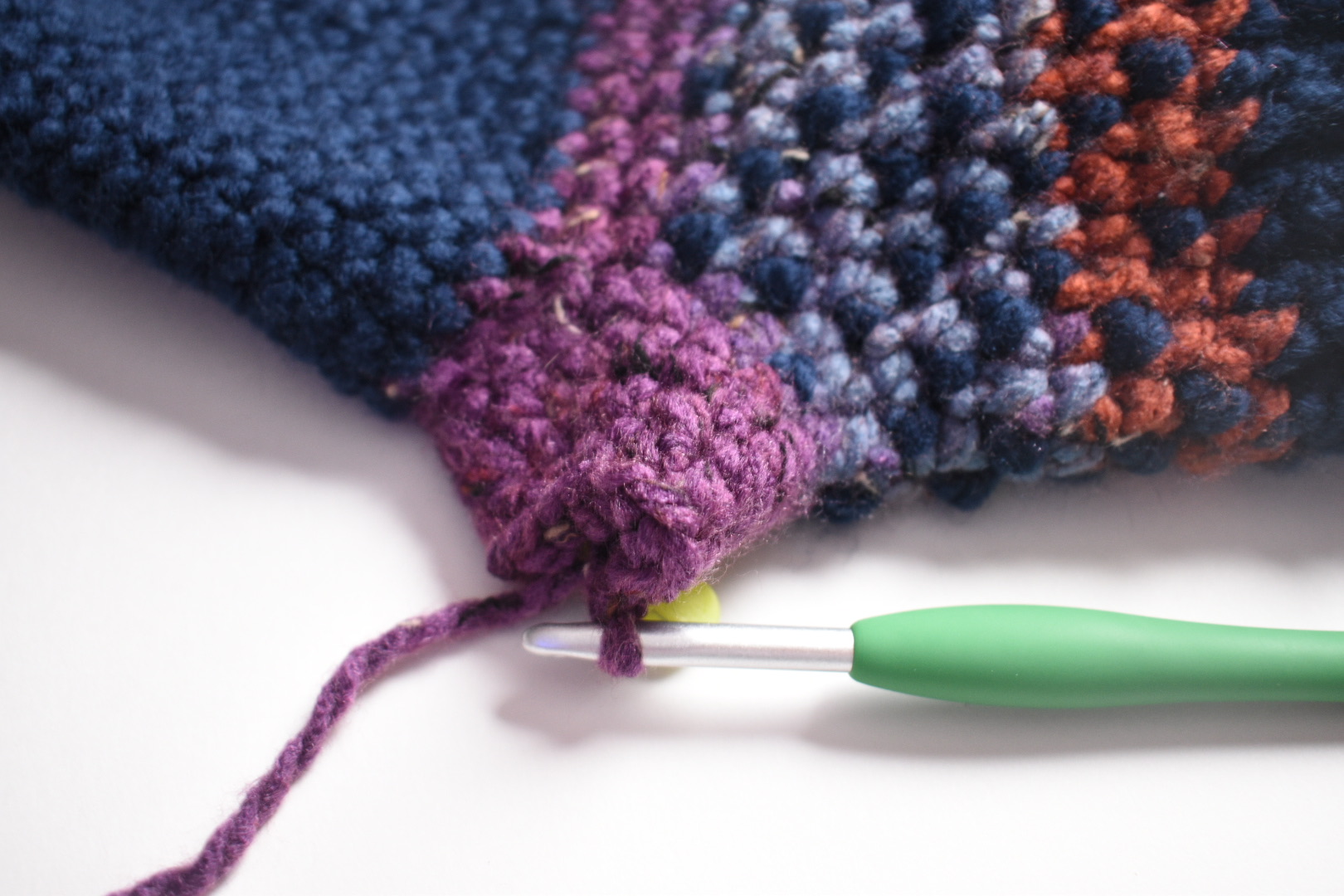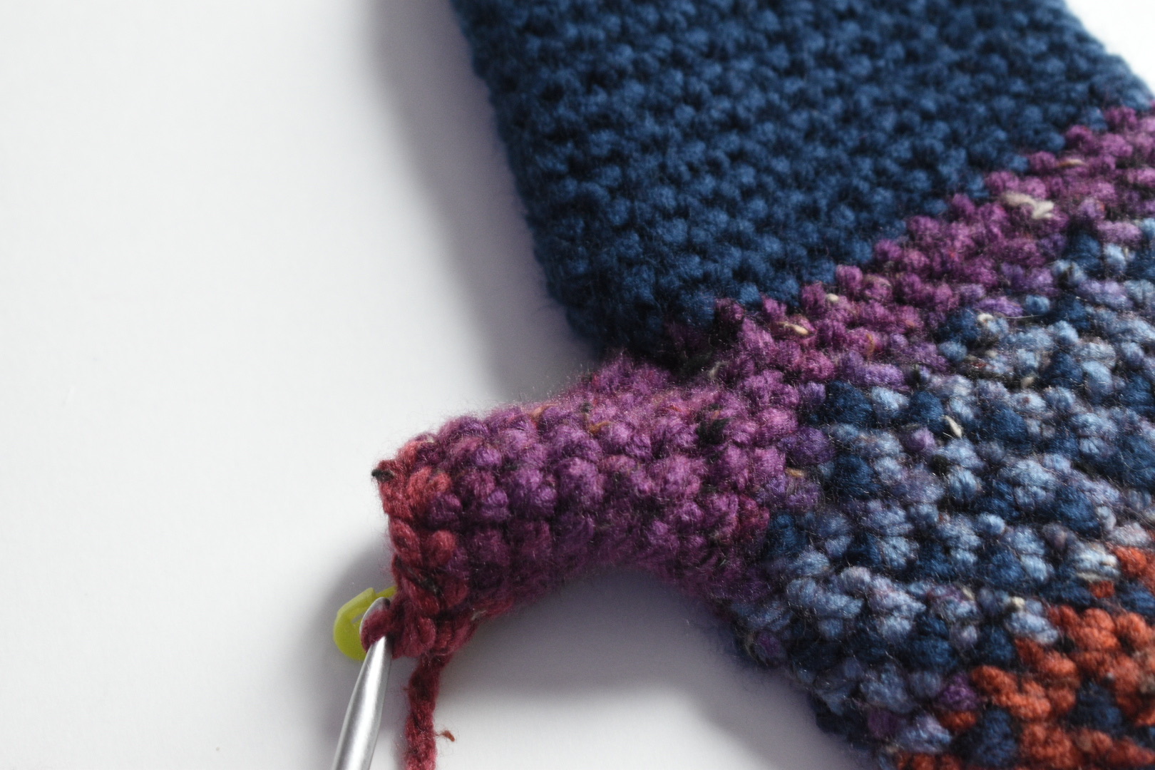 Last is adding the thumb. Using your secondary yarn color, you will pull up 15 stitches around the thumb hole and start working outward from there.