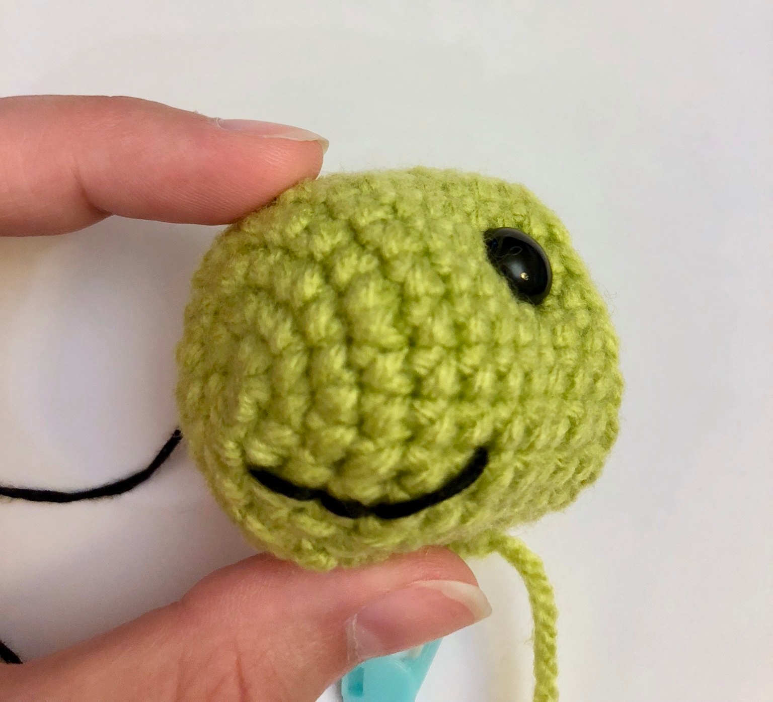 Before you decrease too much, you will want to embroider on a mouth and secure the safety eyes. I only did a smirking mouth on one side of the face, but feel free to play around with it for a different look! The eyes were placed between the 8th and 9th round on either side of the top of the head. You can also start to stuff the head with fiberfill at this point.