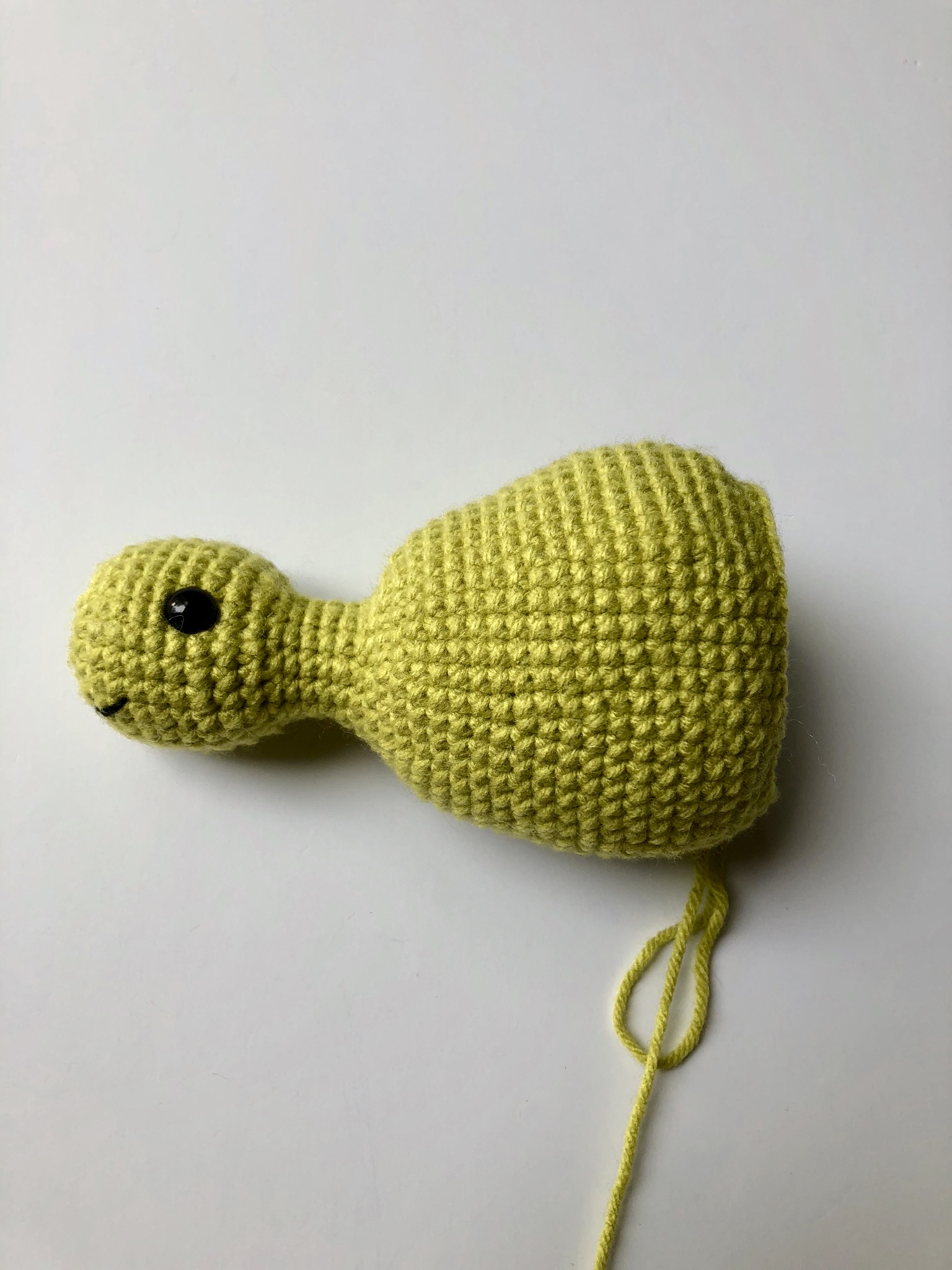 You’ll continue on with the head by working another 2 rounds of gradual increases, followed by a few rounds of single crochets around. The neck is worked by gradually decreasing for a few rounds.