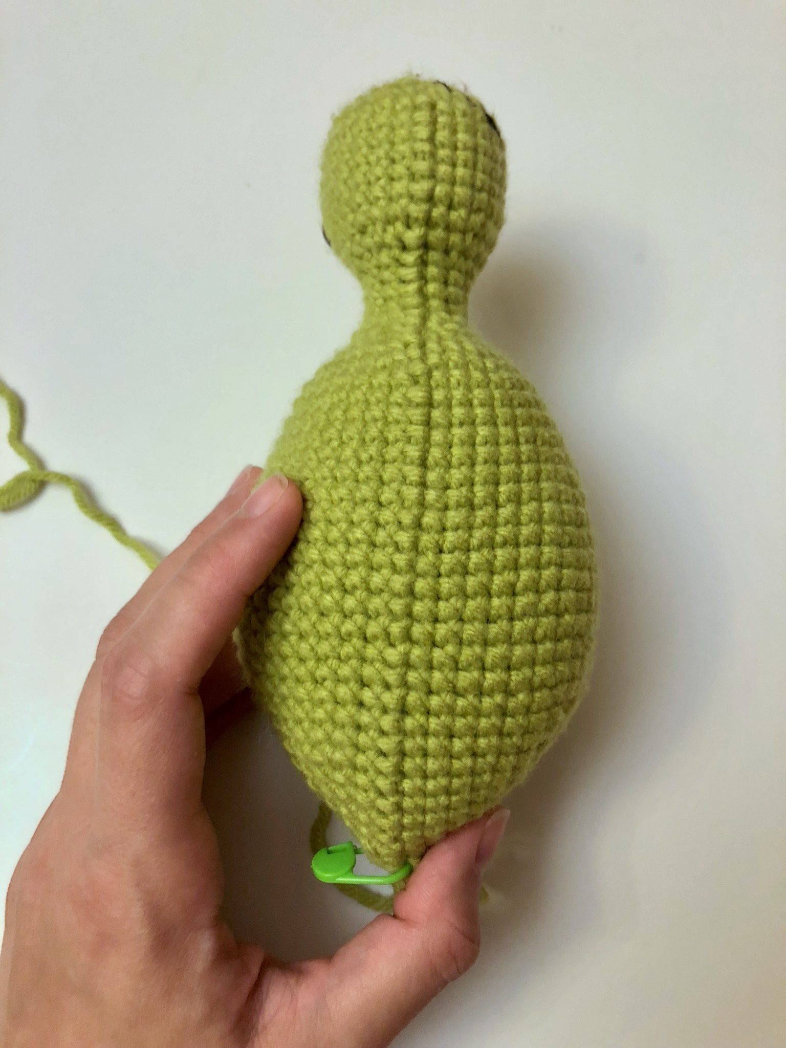 The bottom of the neck/body area is meant to have a more pronounced drop, while the top is meant to have a more gradual increase. To achieve this, you will start to increase across the bottom of Greg, before you start increasing around the top area. Then things flip, while the bottom of the body is meant to be more flat, the top continues to increase. Therefore, the majority of the body is worked with increases happening across the top of the body only.