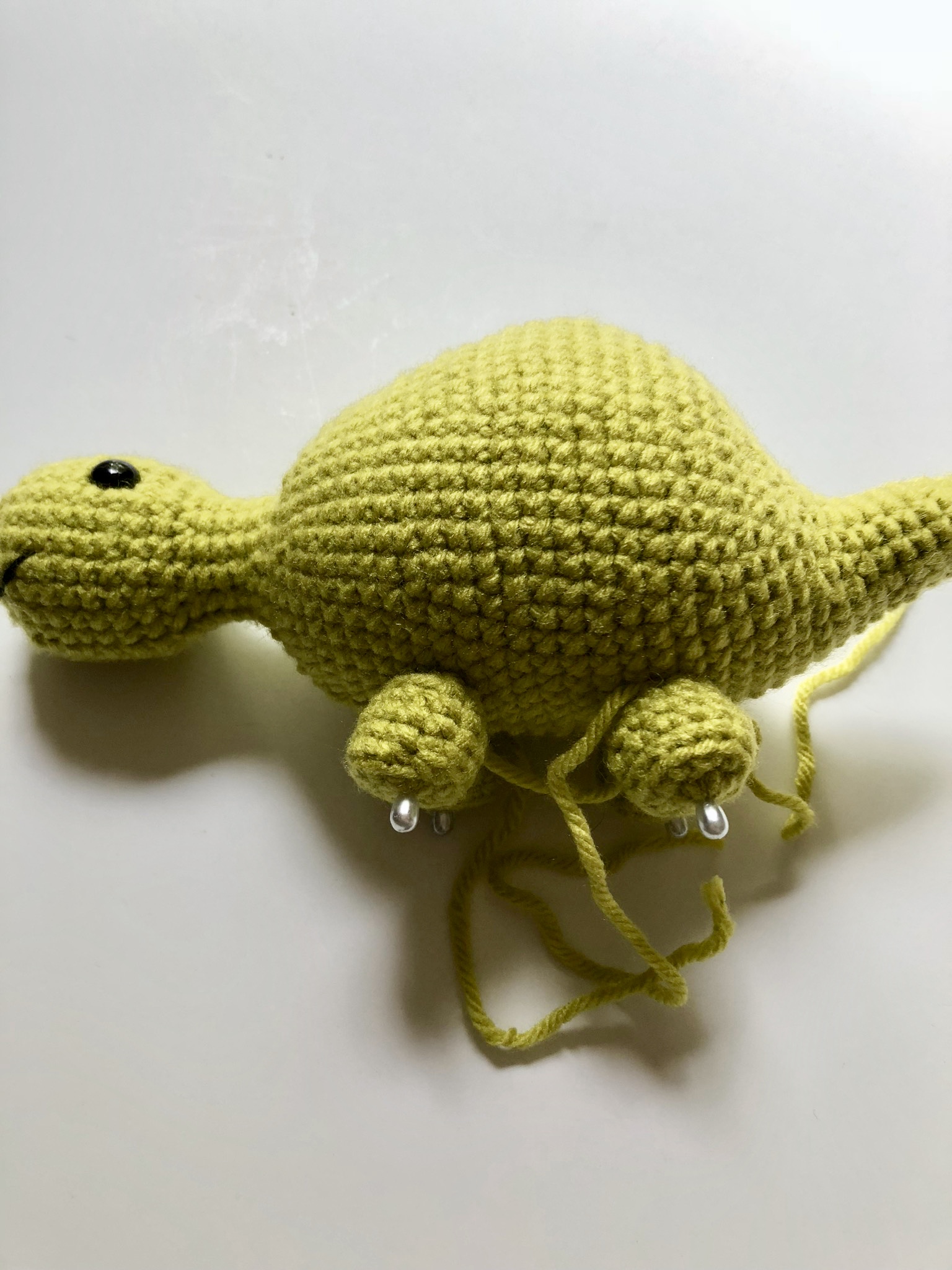 You will begin by adding the legs. I used yarn and a darning needle to attach them to the bottom of the dino’s belly, trying to keep them all evenly spaced apart.