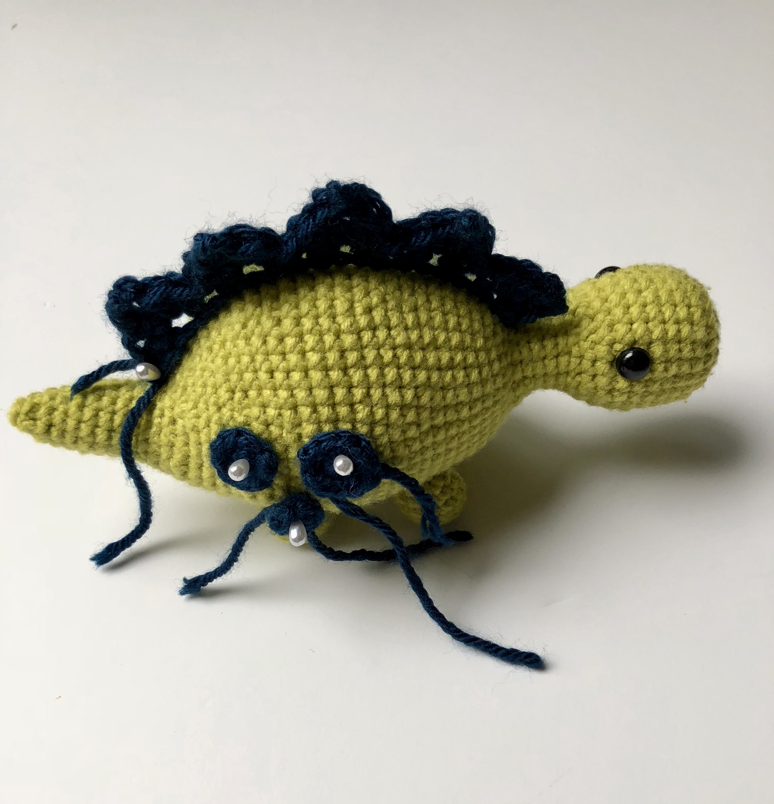 From the first moment the idea of making an amigurumi dinosaur came to me, I knew I wanted to make a stegosaurus and I knew I wanted the head, body and tail to all be one piece. However, since amigurumi is typically worked in continuous rounds, I was having issues getting the stitches to line up the way I wanted for the tail.