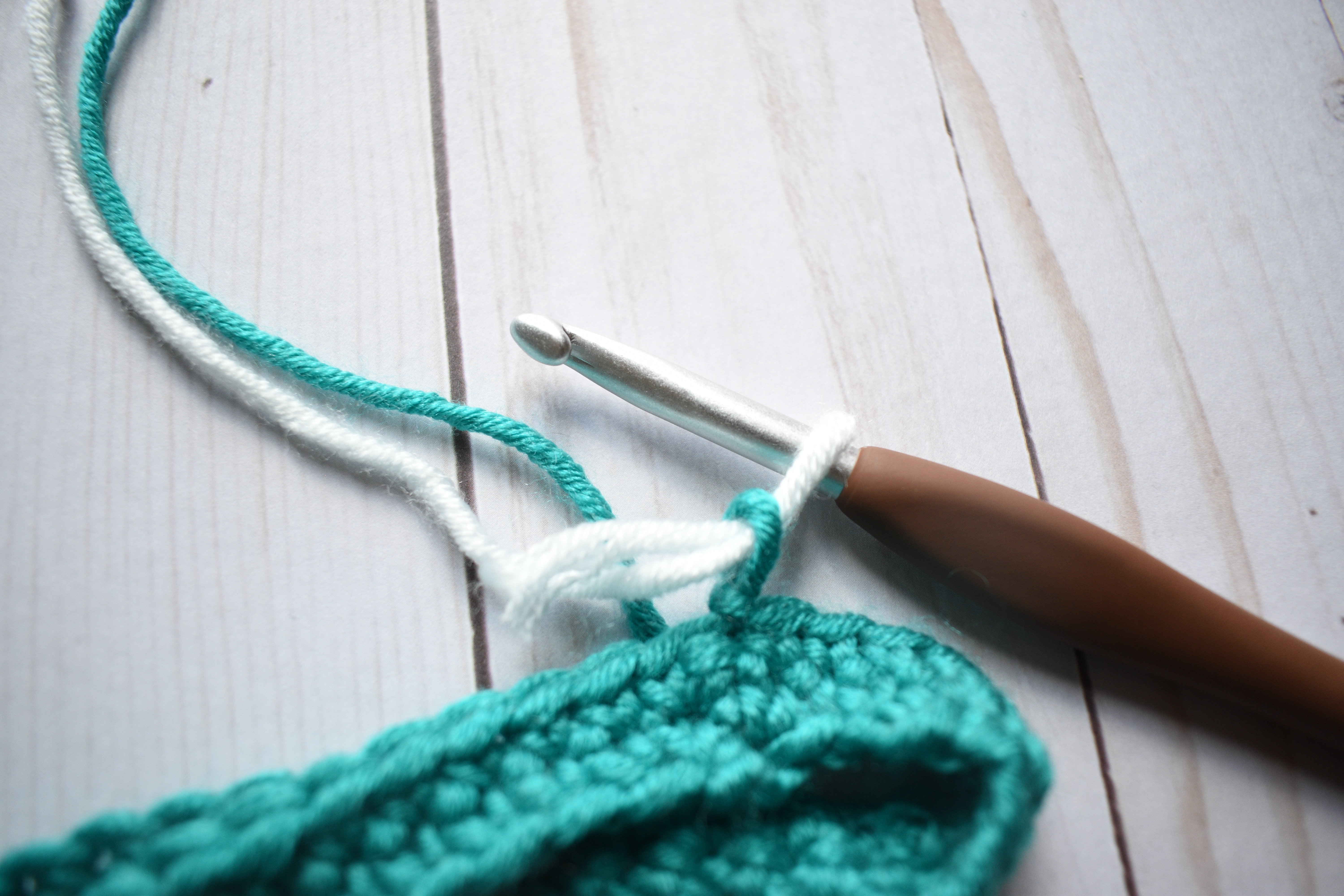 After the completing the 2nd round of the first color, you will pick up the second color (do not cut off the first color).