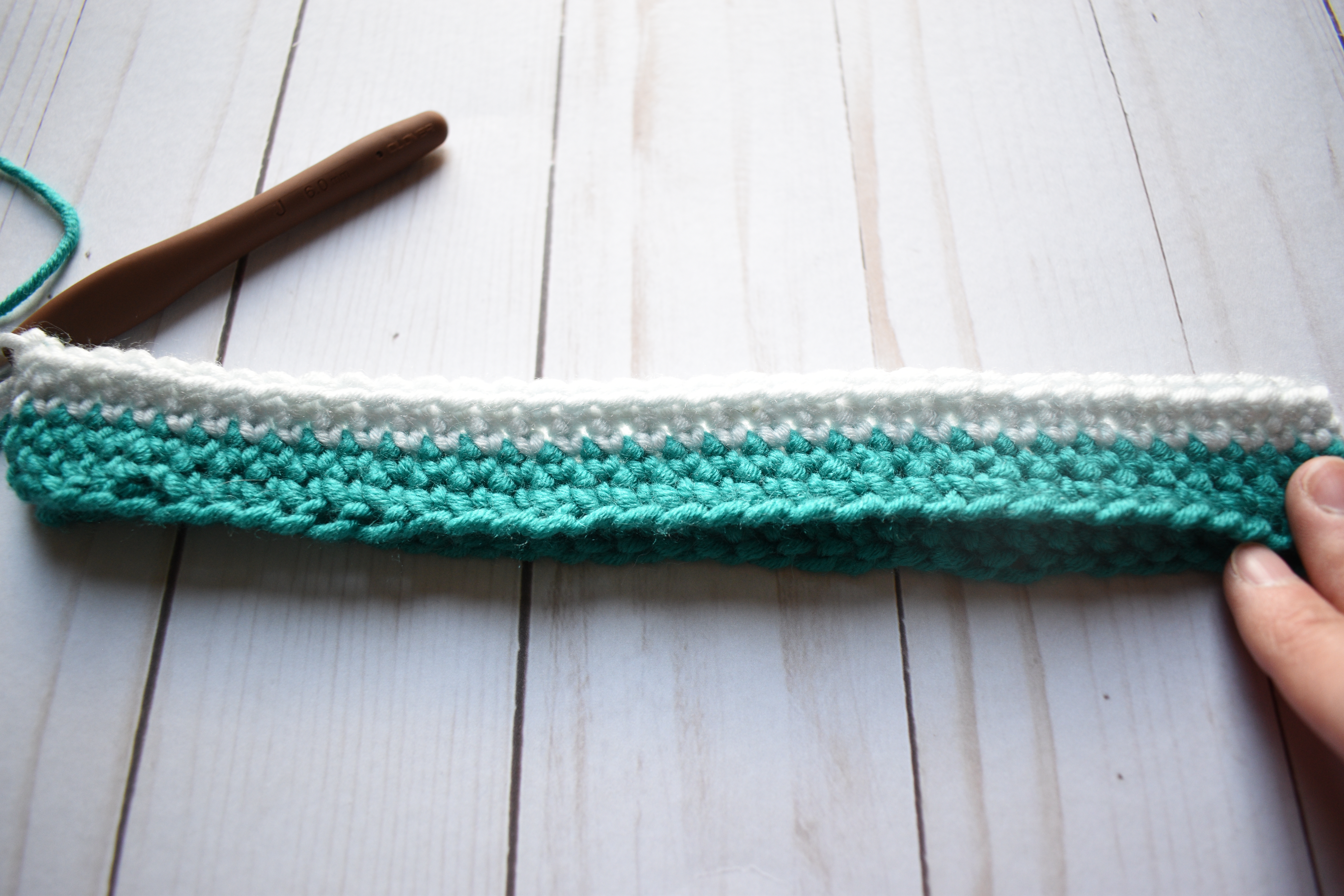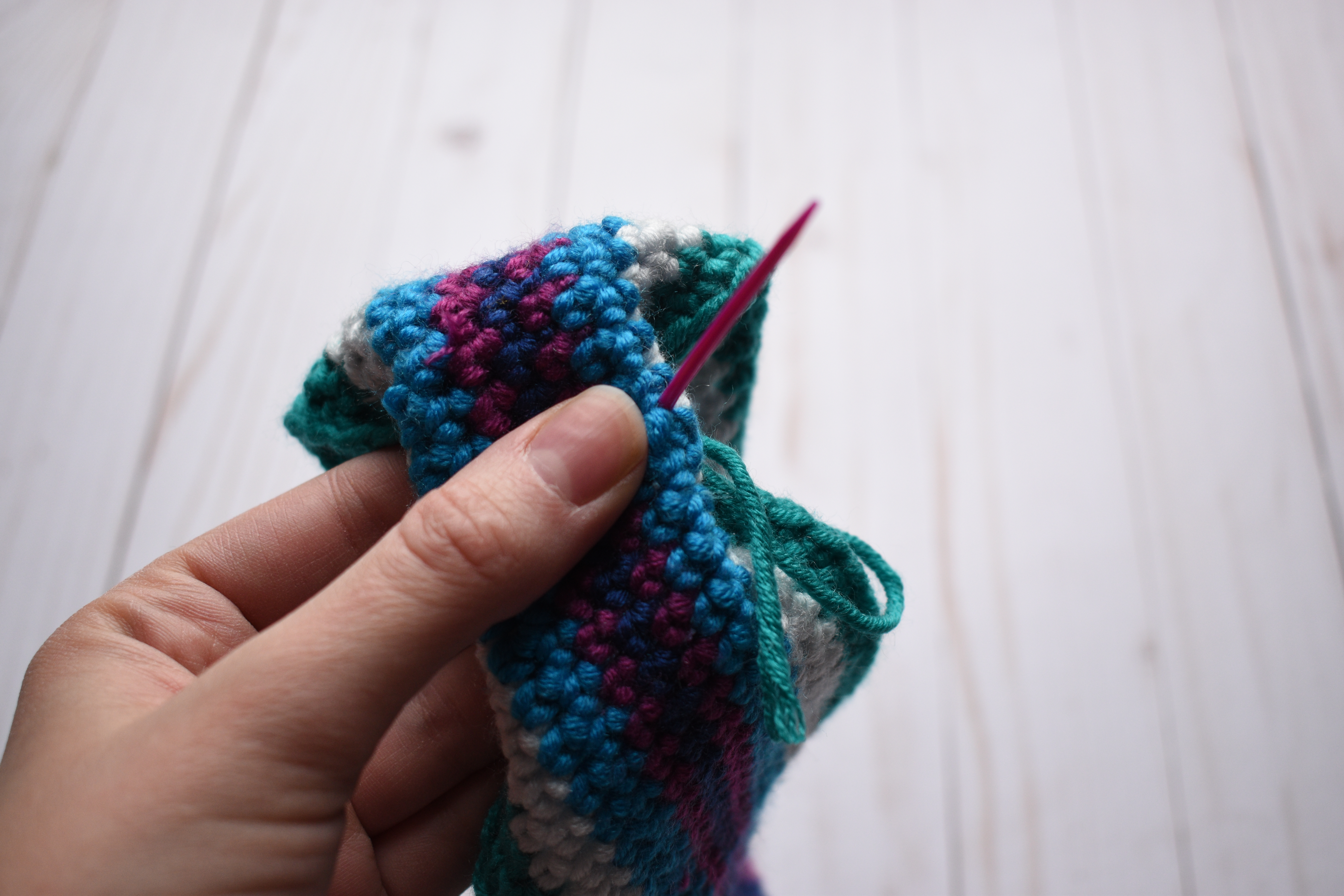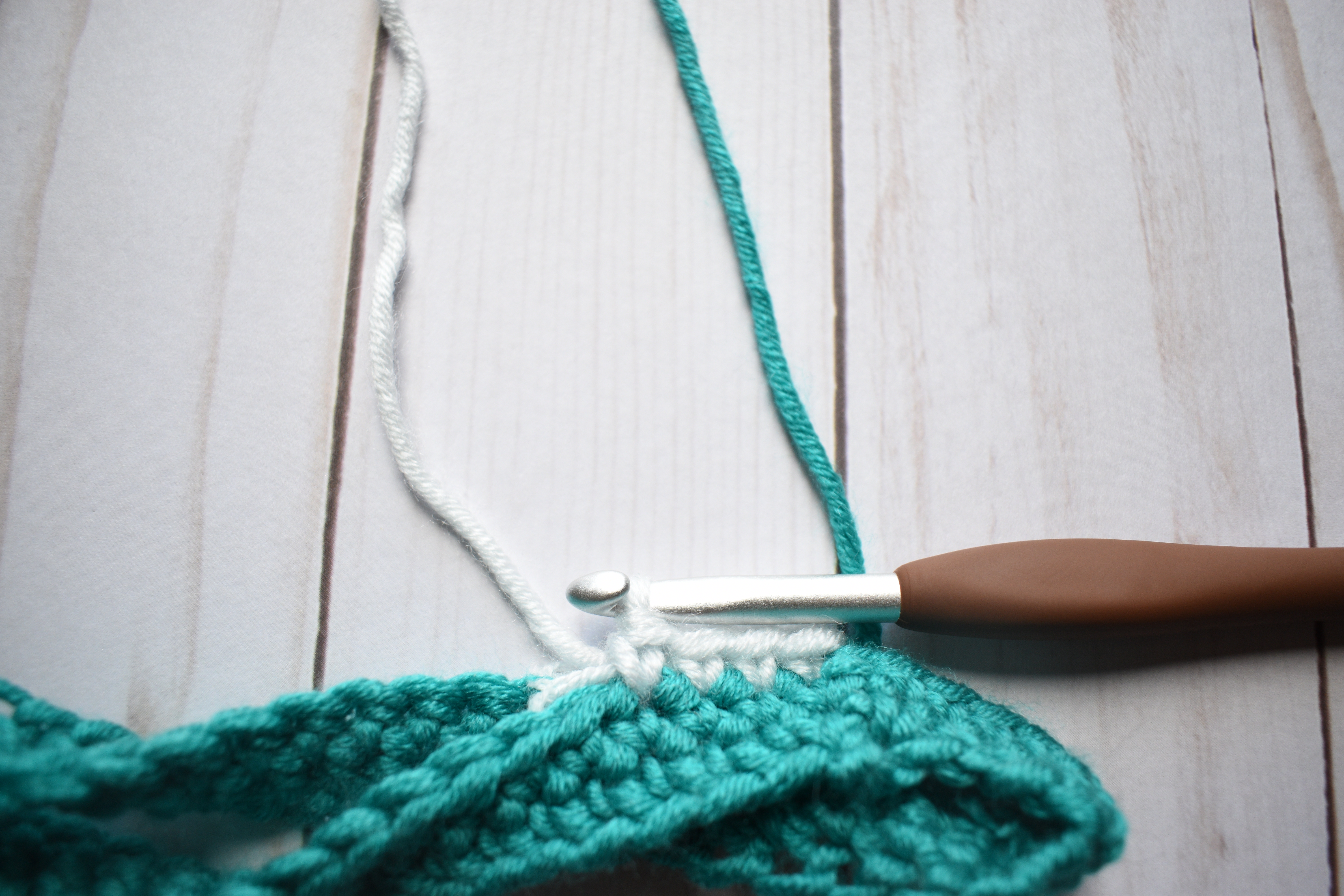 Once the last round in the first color is complete, you can fasten off and leaving a 6-7″ tail.