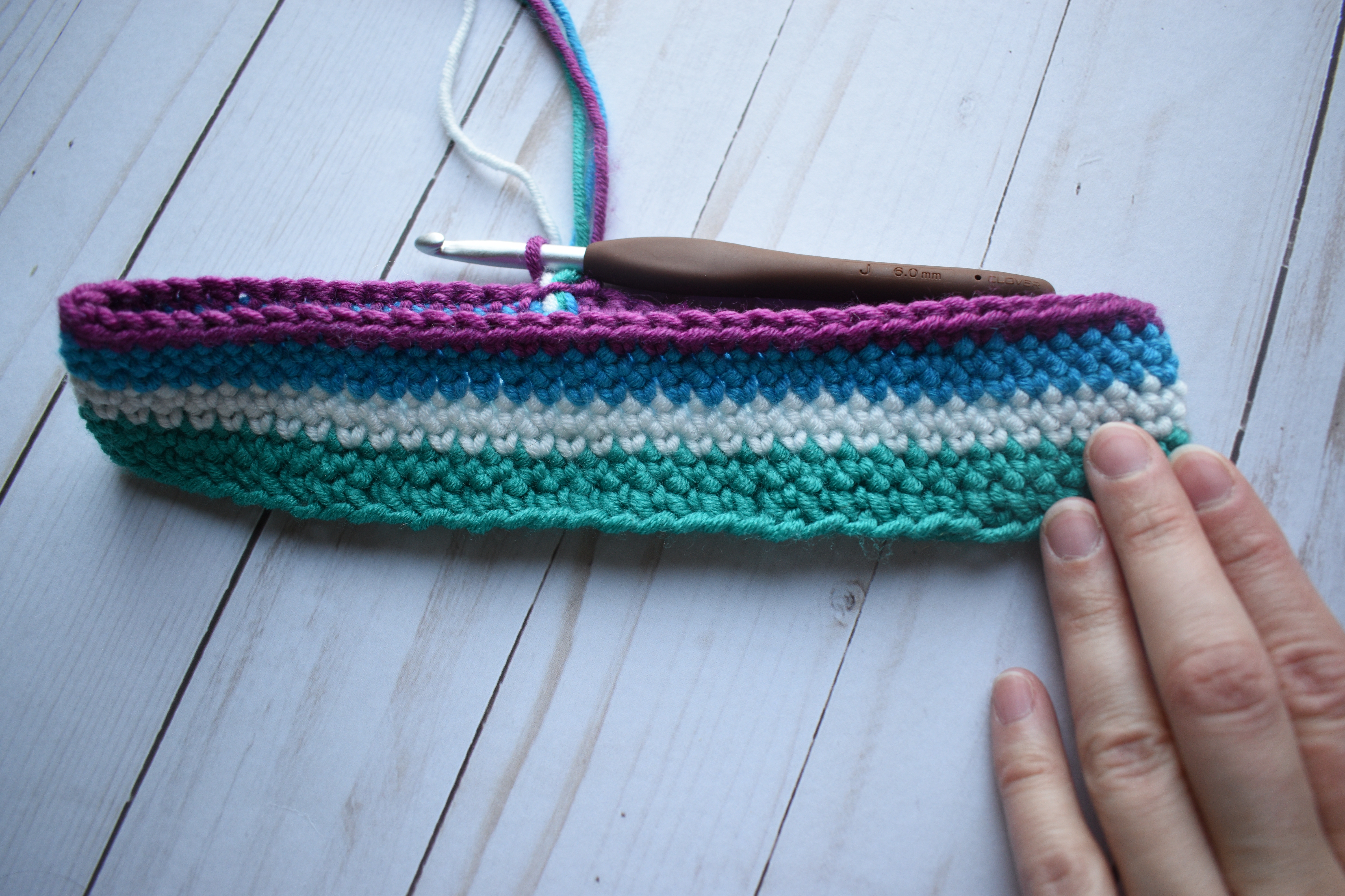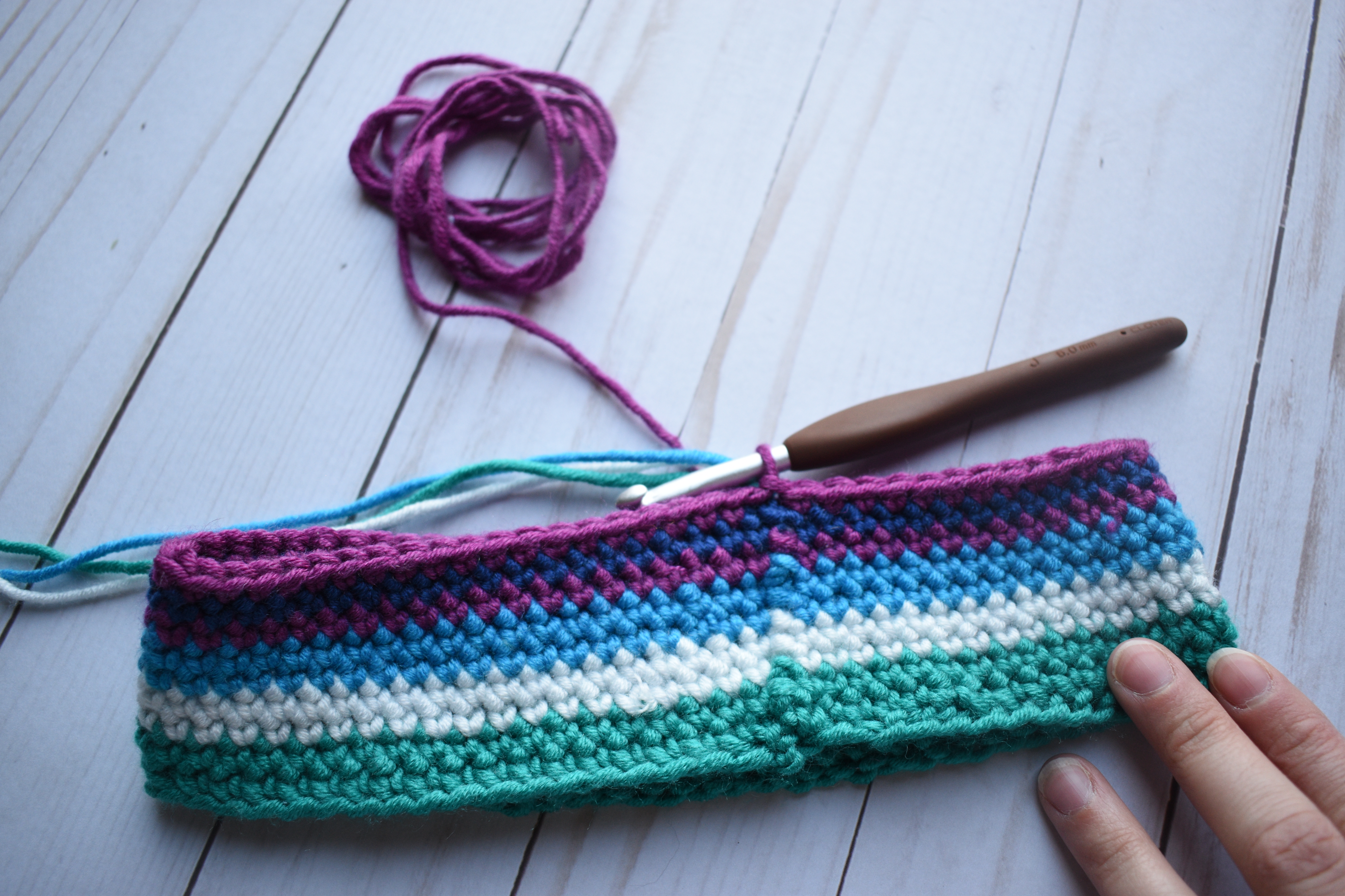 This headband is worked in joined rounds, with the various colors being carried up in the first stitch of each round so there is no weaving in of ends once complete.