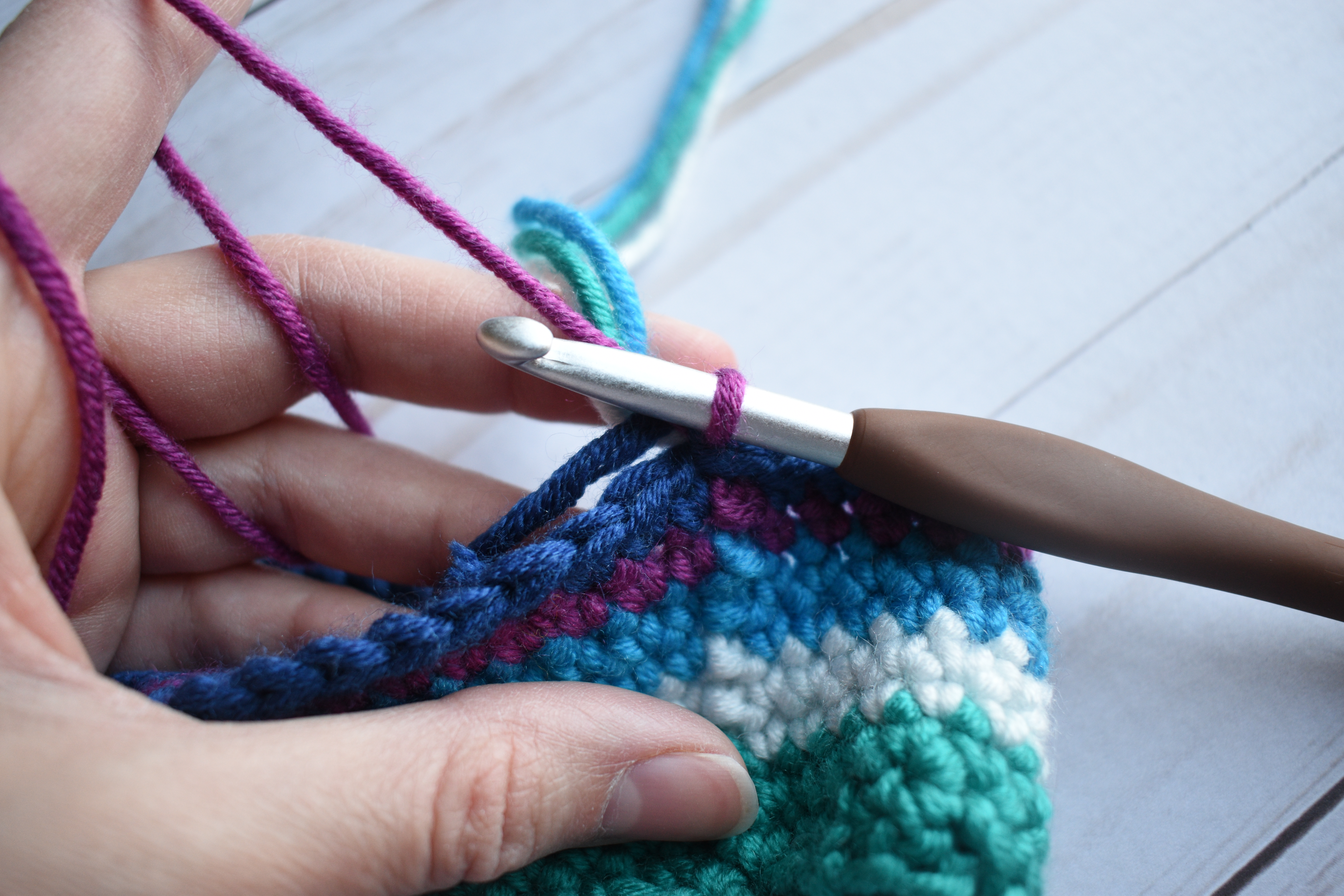 - As mentioned in the picture tutorial above, you will not cut off the unused colors until mentioned in the pattern. Instead, you will carry the unused color strands up into the joining stitch of each round.