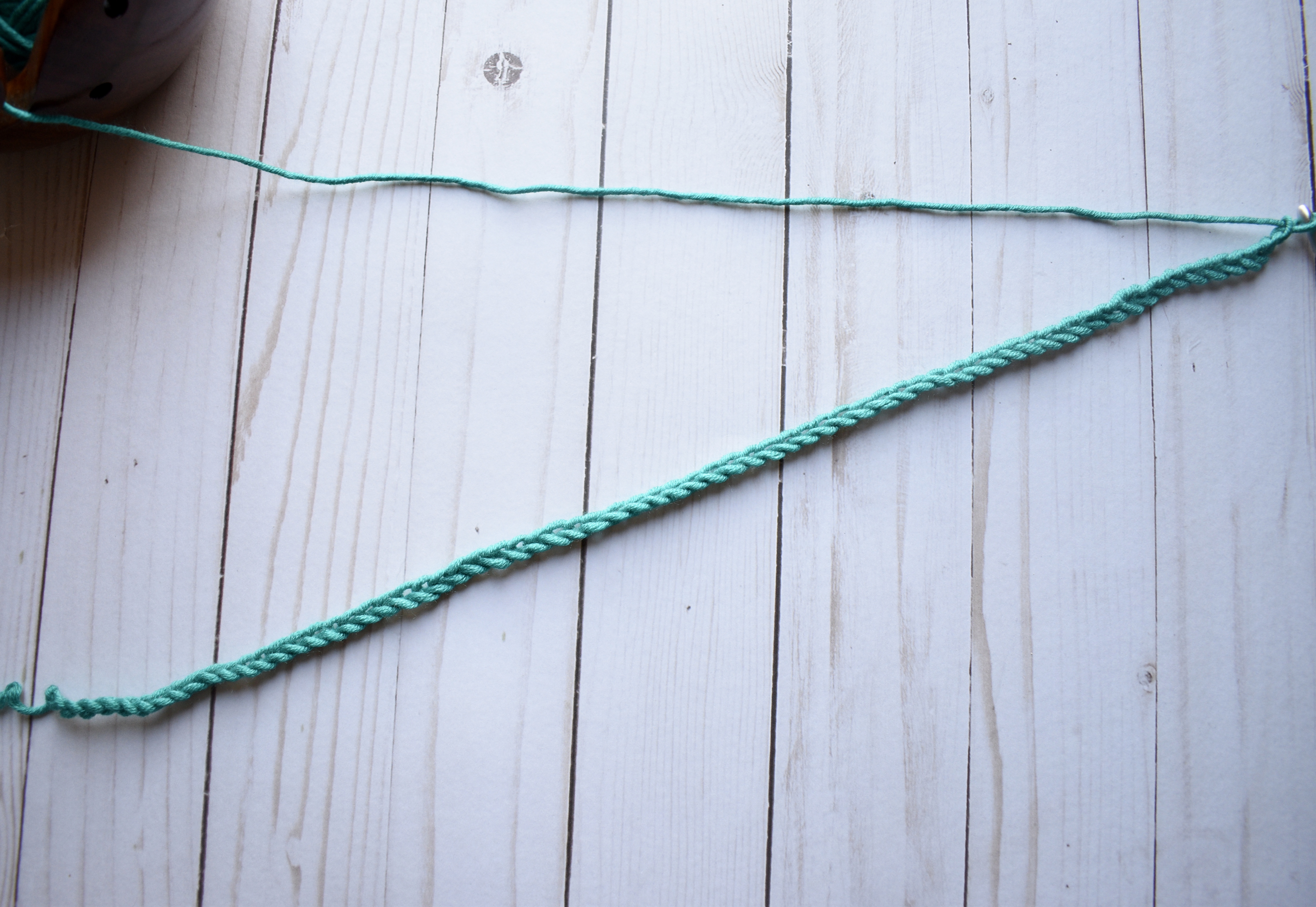 To start the tie, you will chain 12. You’ll then feed it through the center of the headband and join the last chain to the first.