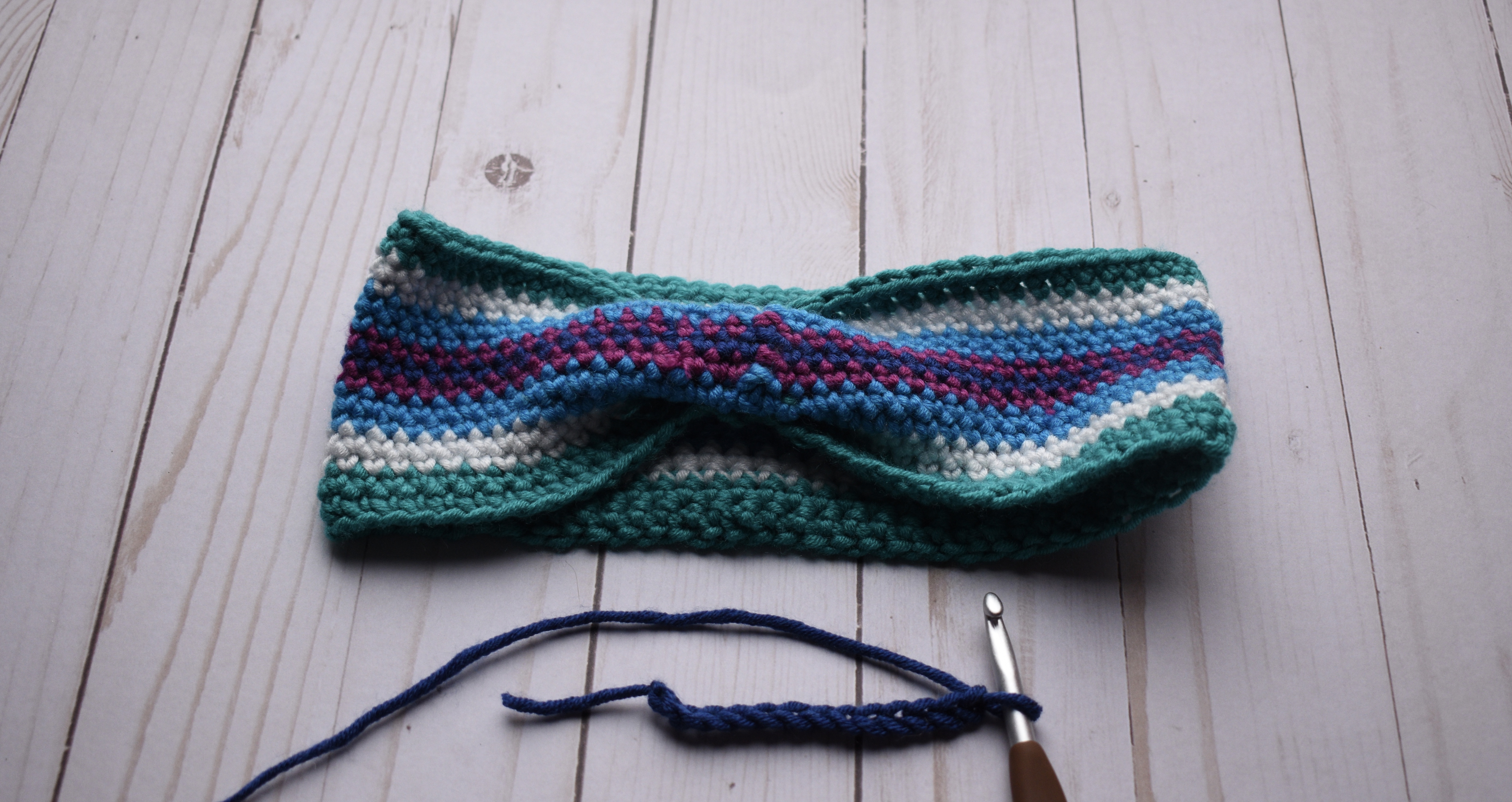 After working the last round of the tie, you will fasten off and weave in the end. Twist the tie so that the joins are underneath the headband, and you’re all done!