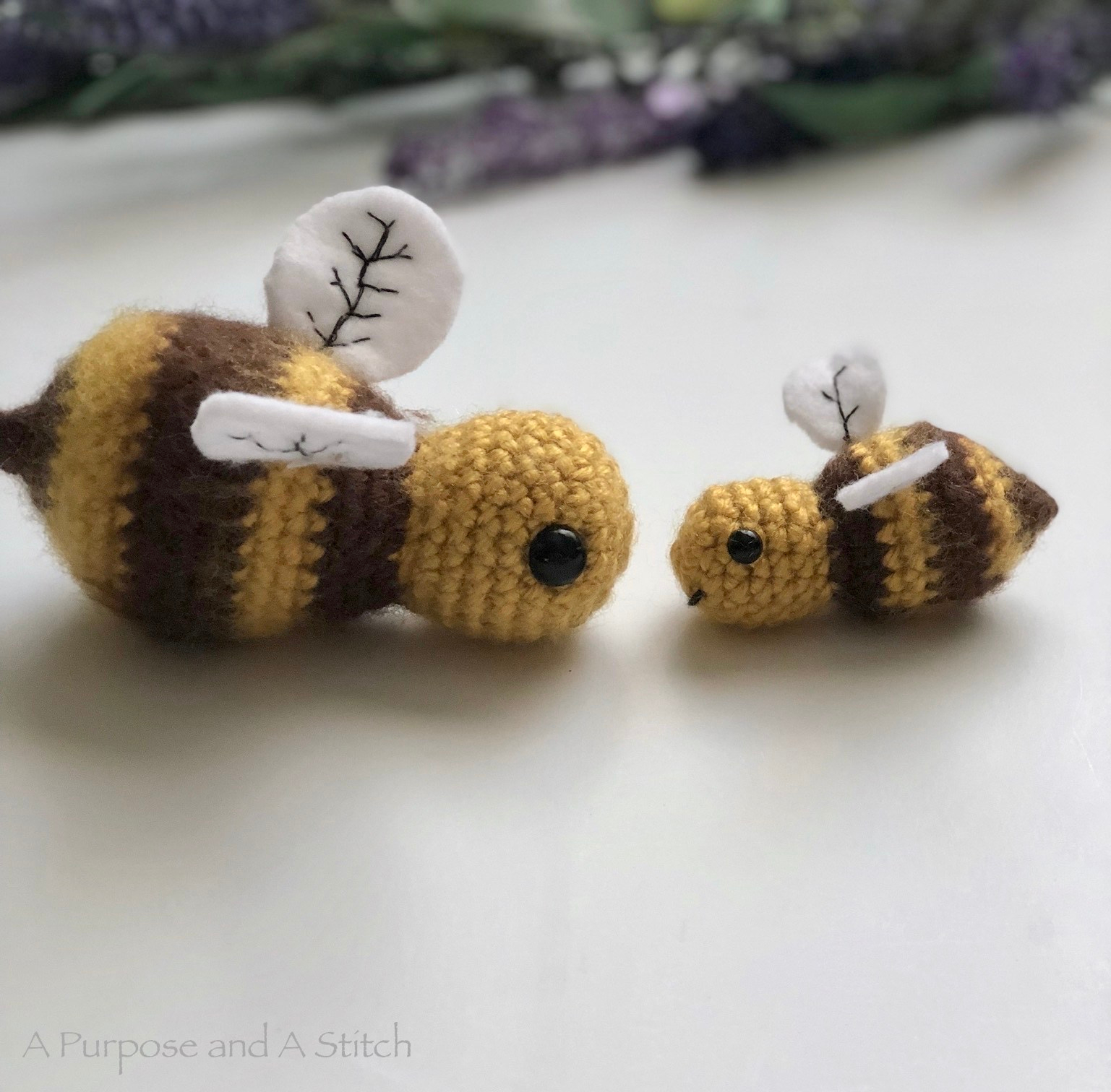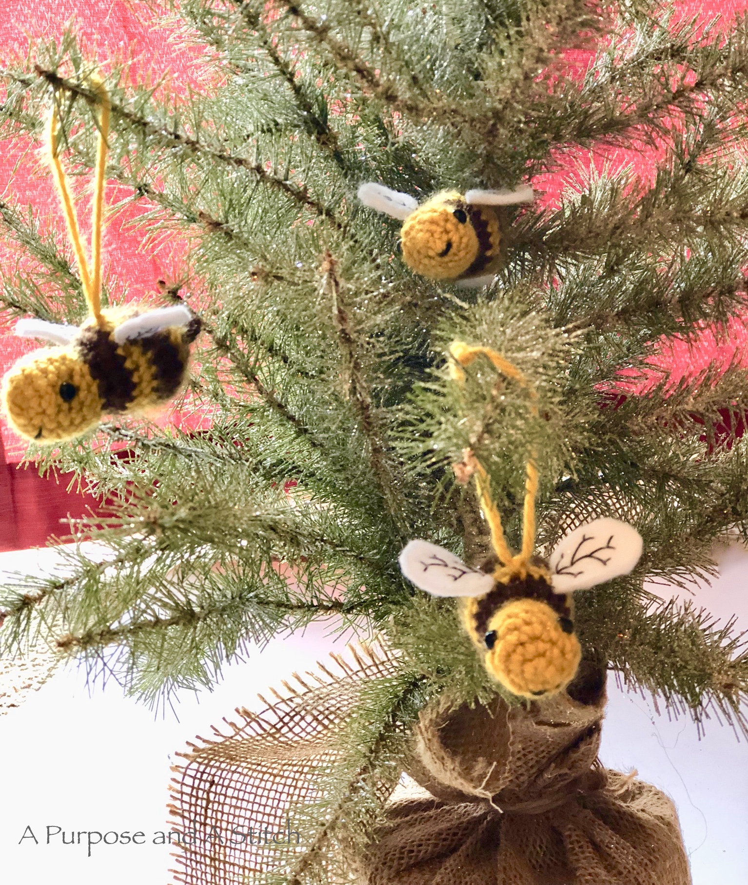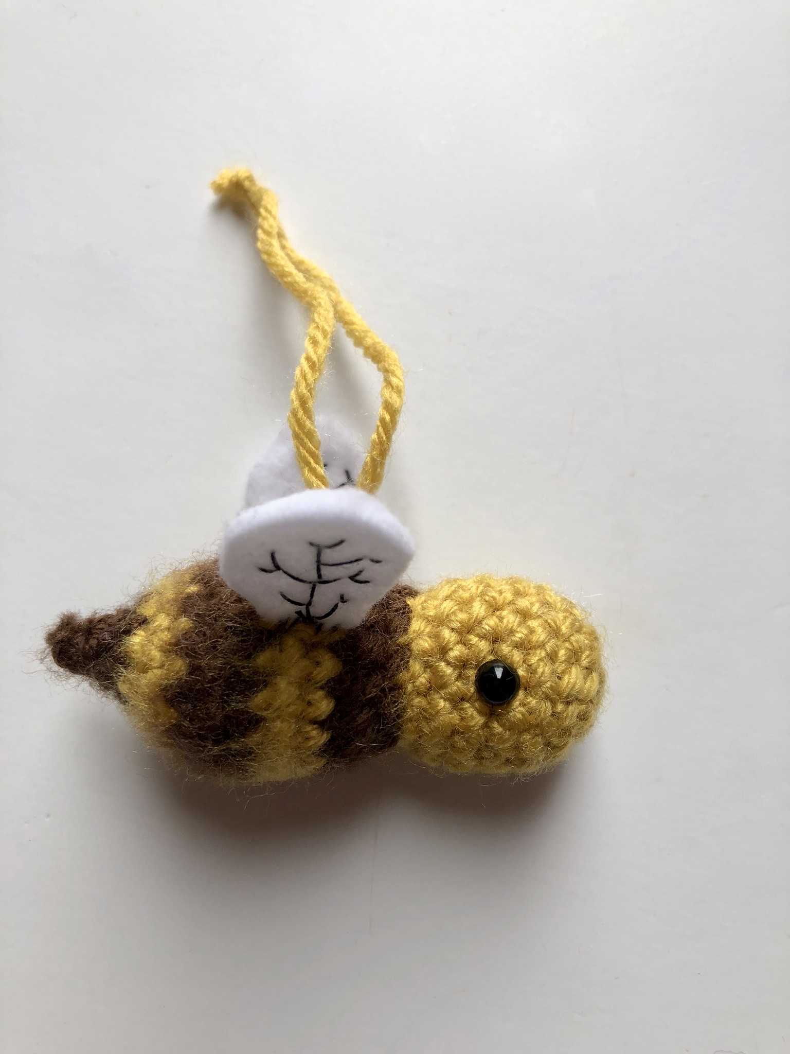 Both mommy and baby bee are created with the same pattern in mind, the baby is just created with a smaller hook, and less stitches and rounds. Other then that, they are exactly the same. The ornament version is simply the baby sized bee with a strand of yarn worked through a stitch on the back.