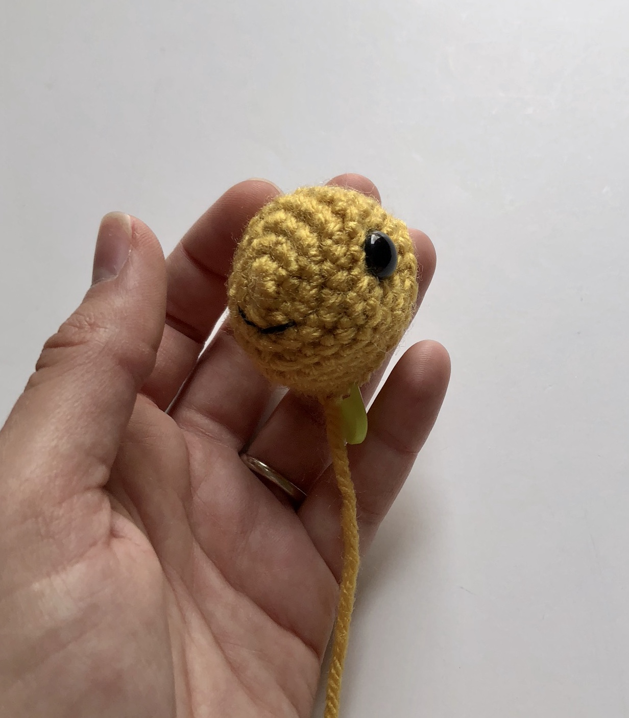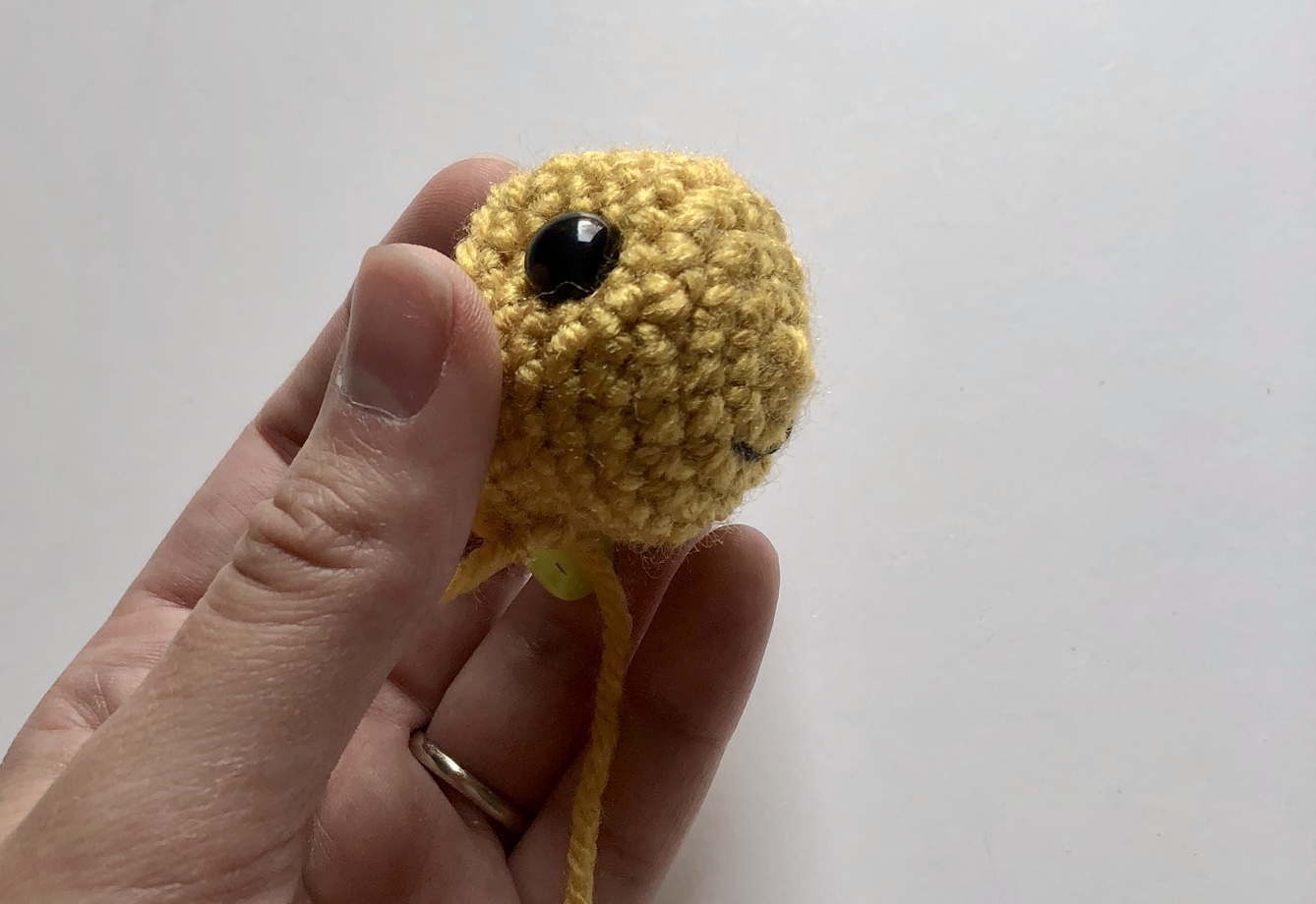 At this point, you will embroider on a cute little smile with black embroidery floss, and fasten your safety eyes in place on either side of the head. Make sure that your starting chain is located at the bottom of your work when you do this. You want the mouth to be located above your starting chain so that the color changes will be well hidden on the bottom of the bee.
