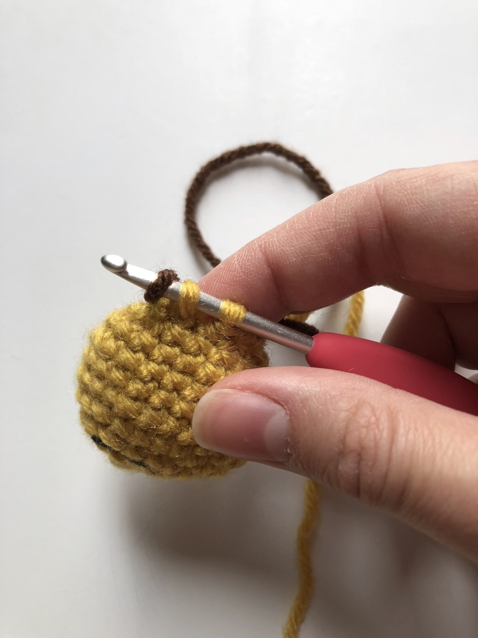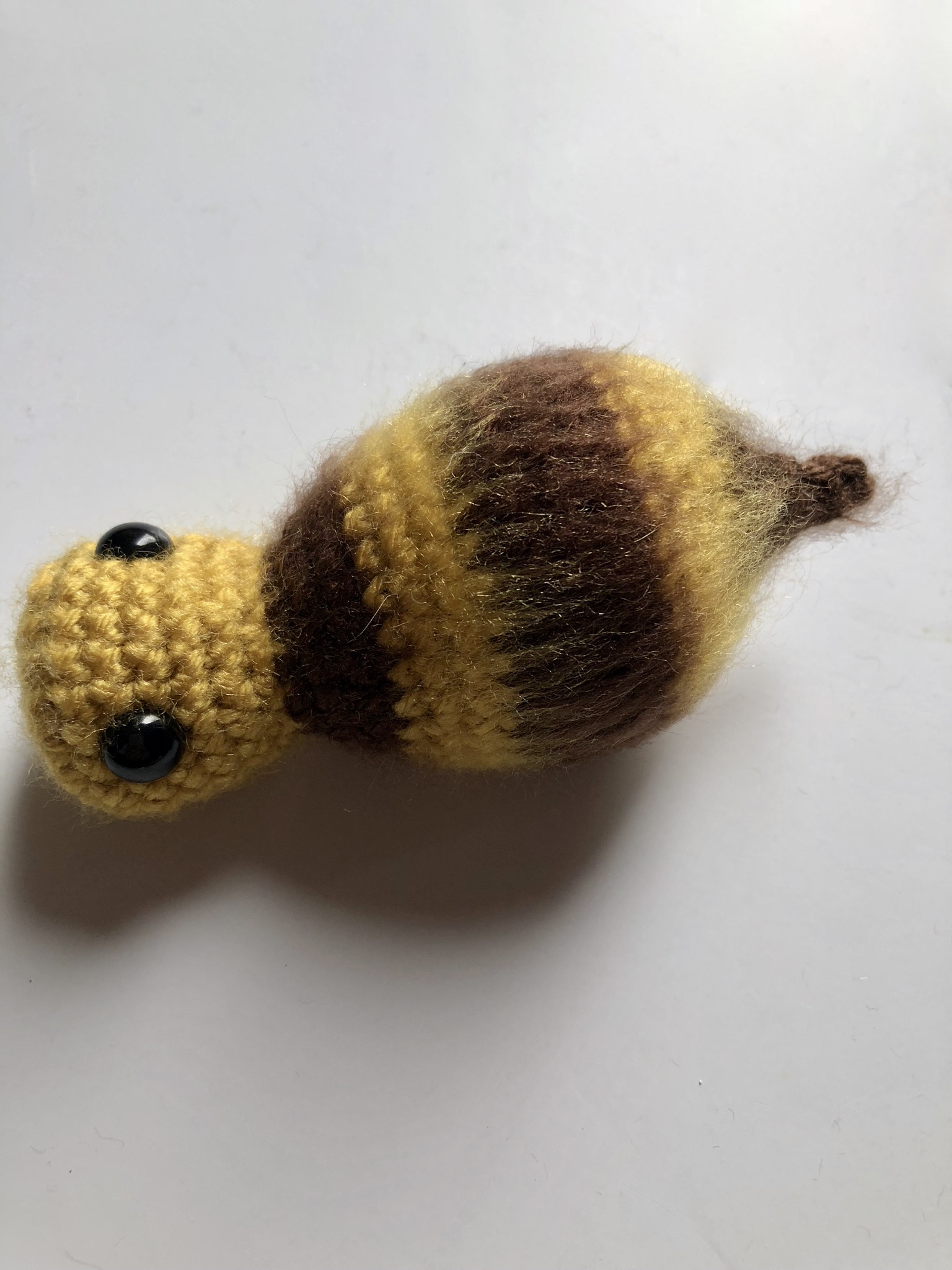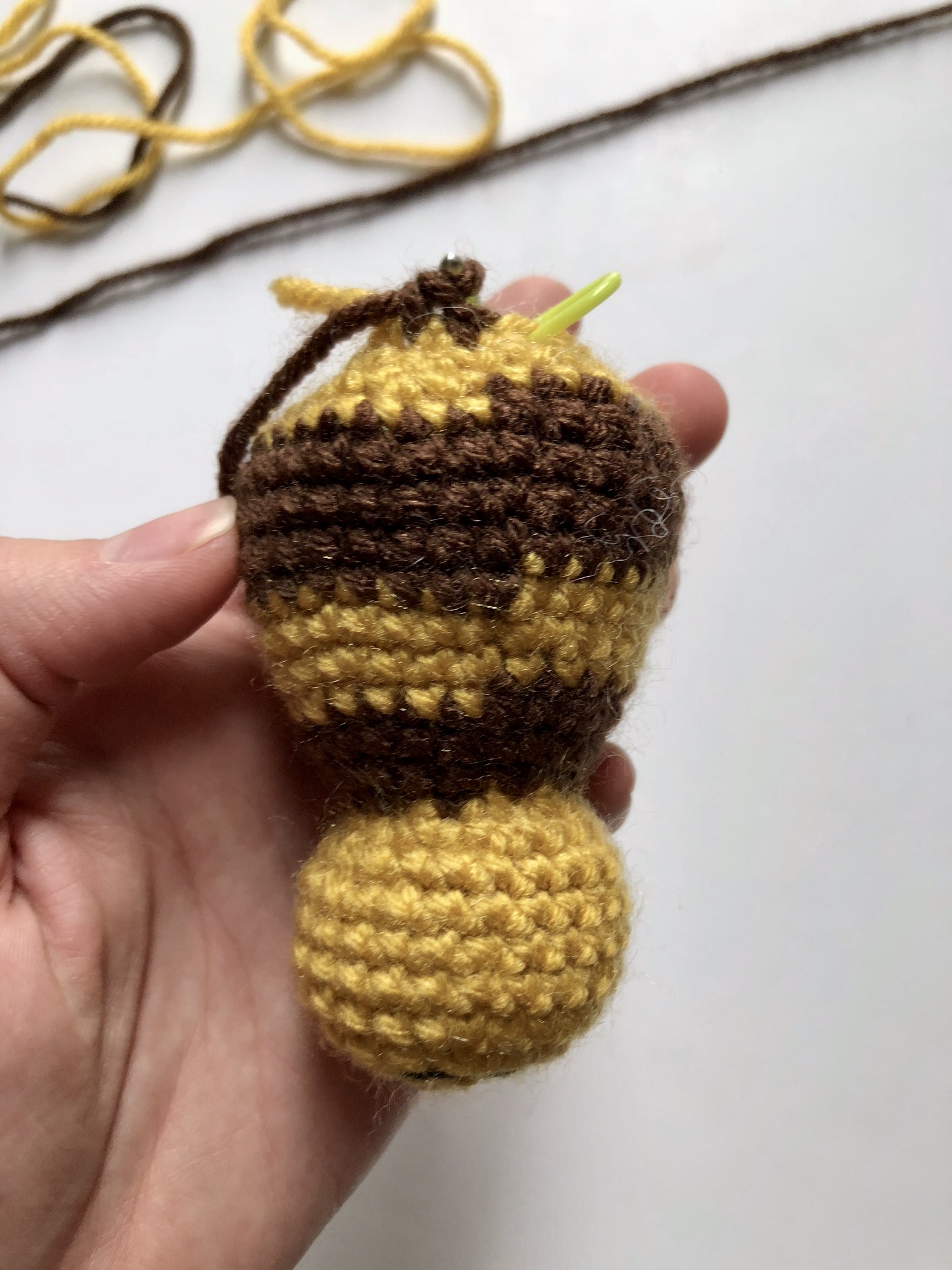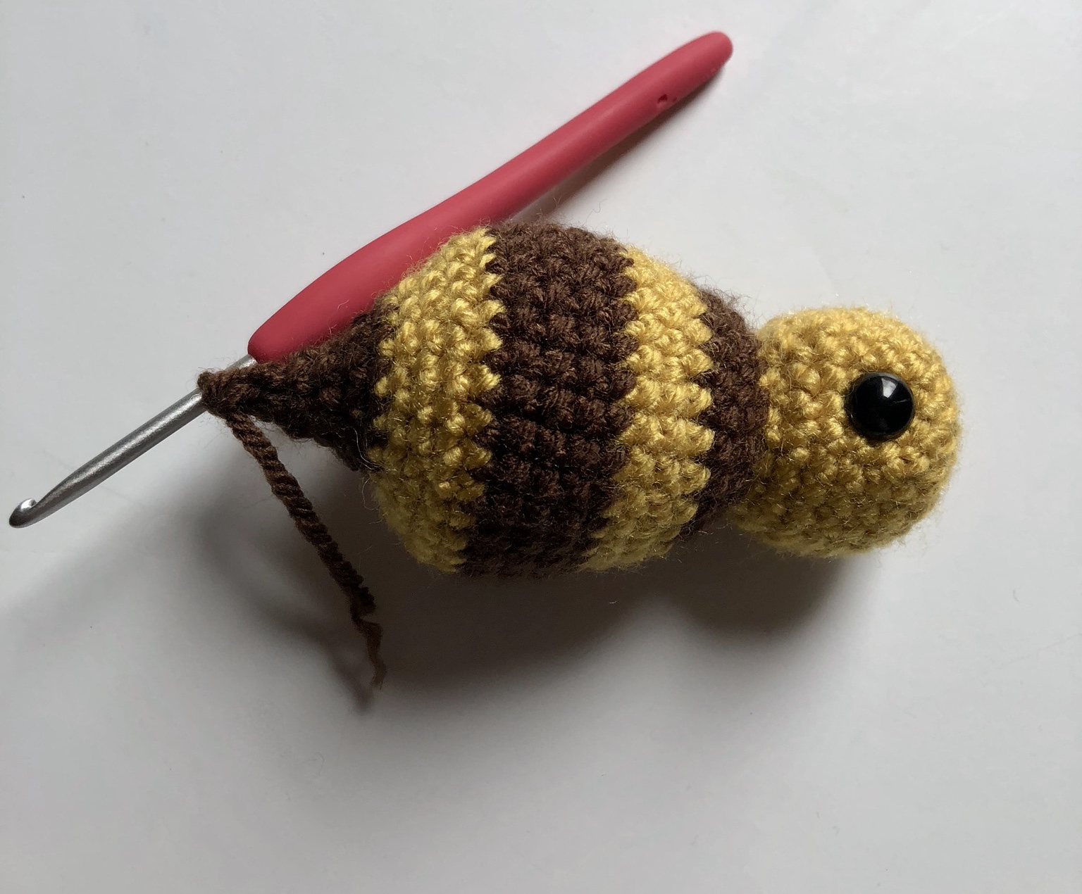 The bee will finish in brown (you can cut the yellow yarn after your final color change and carry the tail behind your brown stitches to secure in place). The stinger is created by working decreases until the hole closes at the end, then fastening off and feeding your tail through that hole towards the center of the bee’s body.