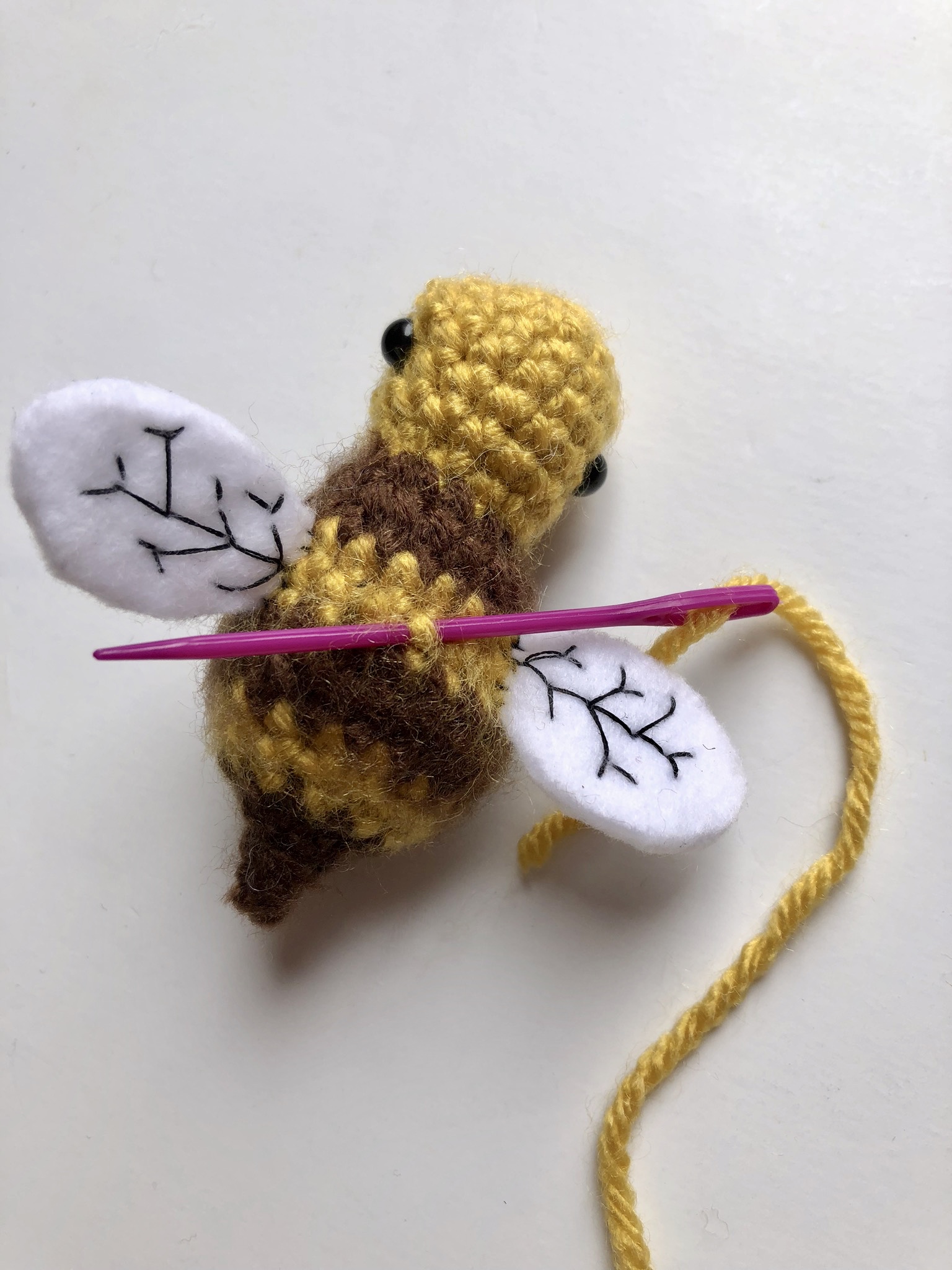 Once you have 2 wings, attach to the bee’s back using needle and thread.