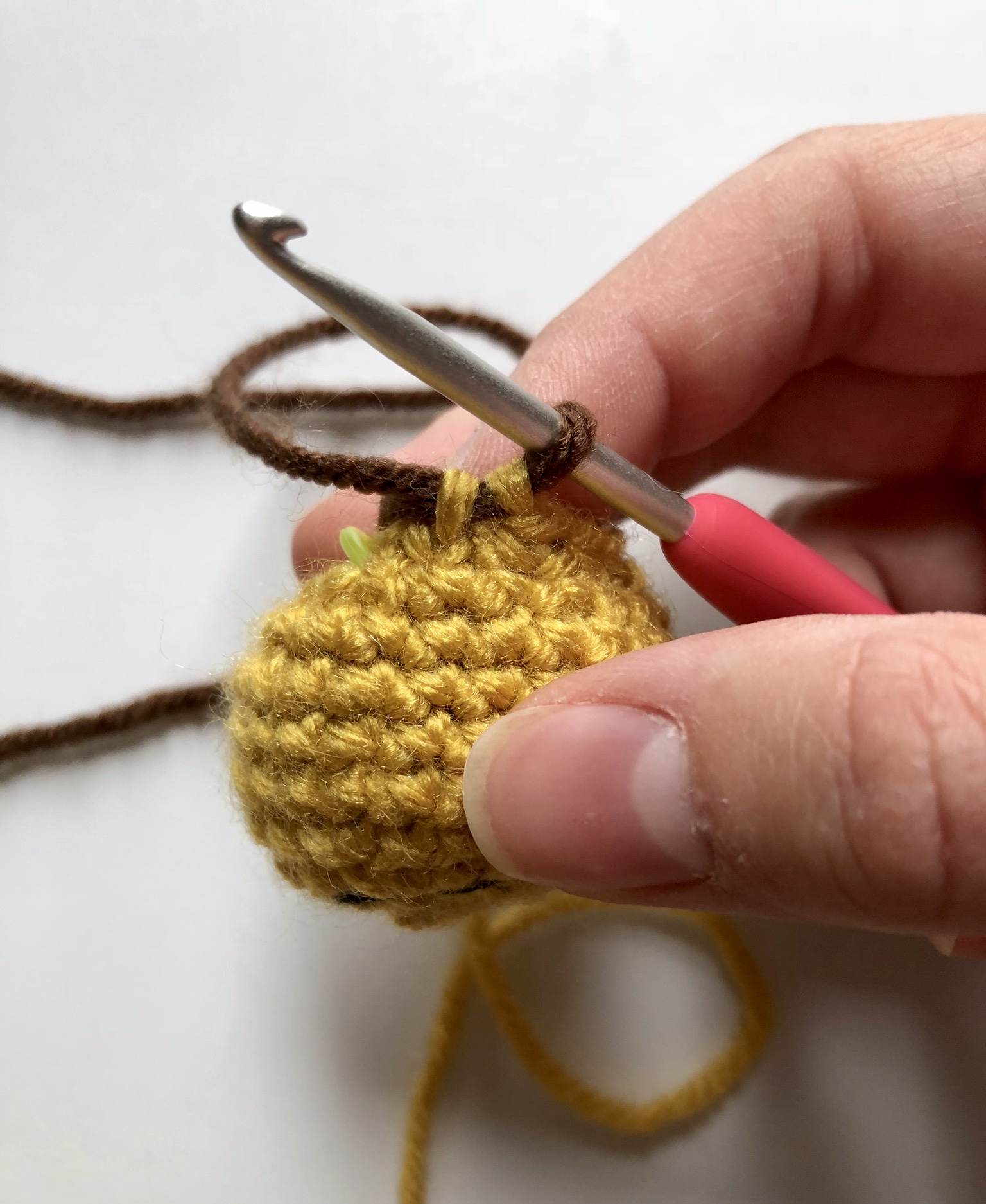 For the next few rounds you will be switching to the brown yarn. I started my color change in the last stitch of the round just prior to the color change round. I did so by working the last single crochet as normal until the very last yarn over and pull up.