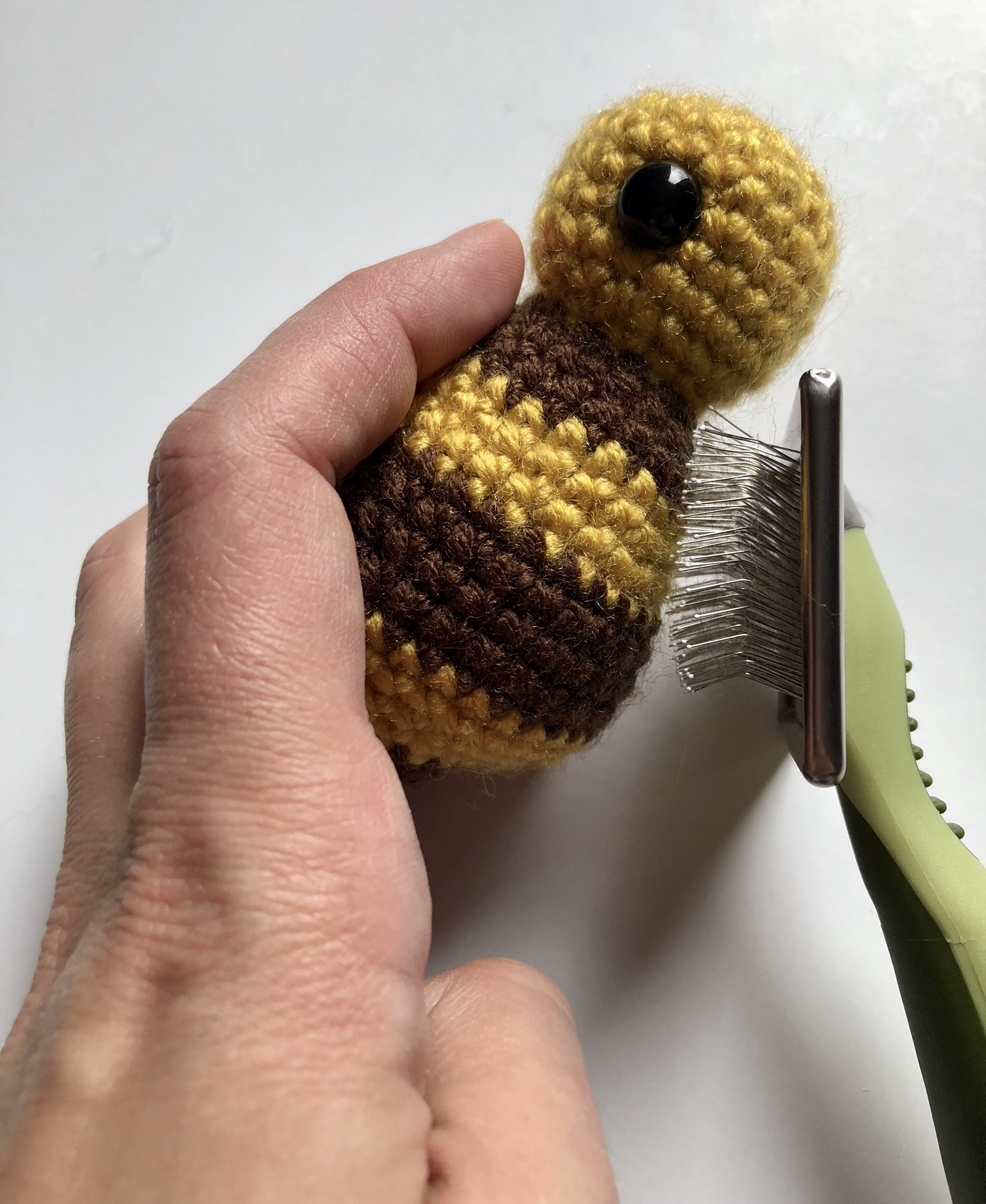 Since honey bees are furry, I wanted this guy to look furry too, so the dog slicker brush will help achieve this. Just go to town with it, agitating the fibers until you’re happy with your bee’s furriness.