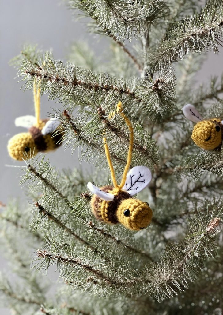 Both mommy and baby bee are created with the same pattern in mind, the baby is just created with a smaller hook, and less stitches and rounds. Other then that, they are exactly the same. The ornament version is simply the baby sized bee with a strand of yarn worked through a stitch on the back.