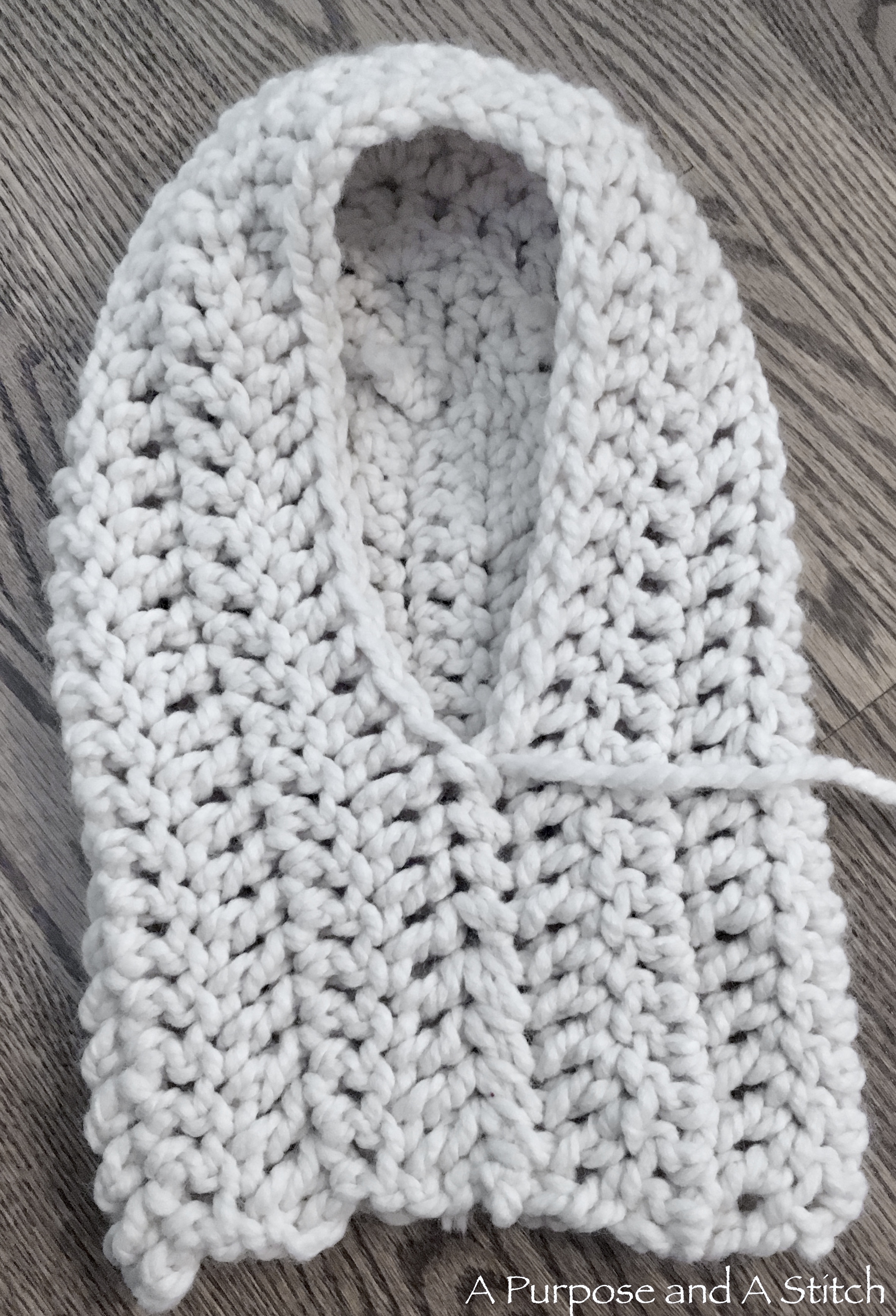 ** For the Toddler size, you will fasten off after row 10, leaving a long tail for whip stitching the cowl