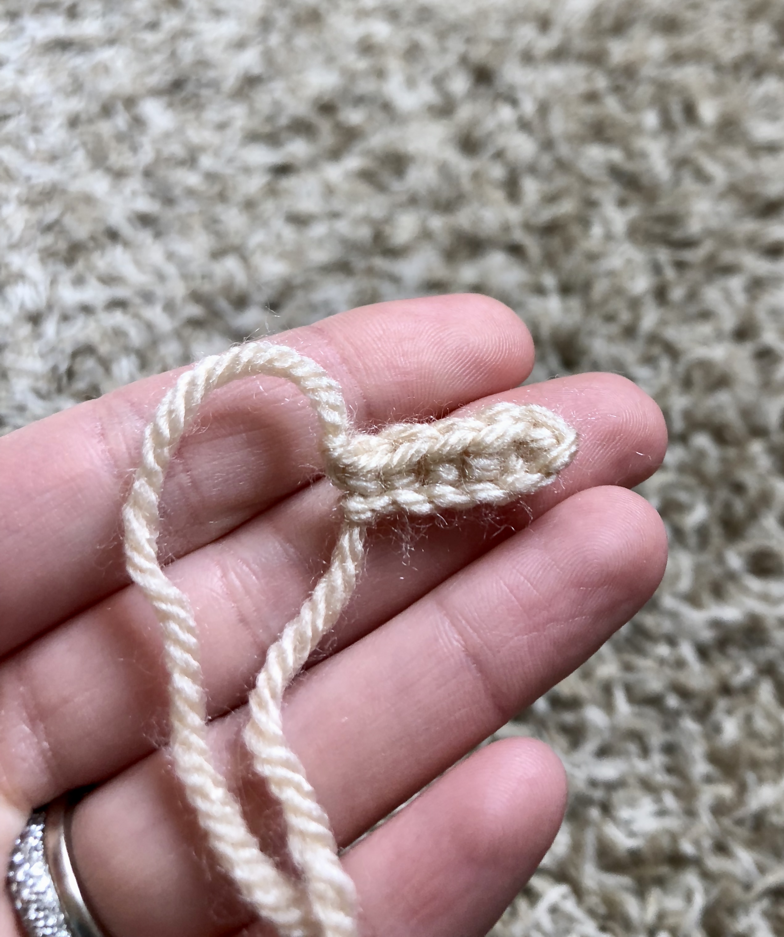 The last piece to make is the tail which is just a few chains, and one row of single crochets. At the very end of the tail you will add in some eyelash yarn or embroidery floss to give a fluffy finish.
