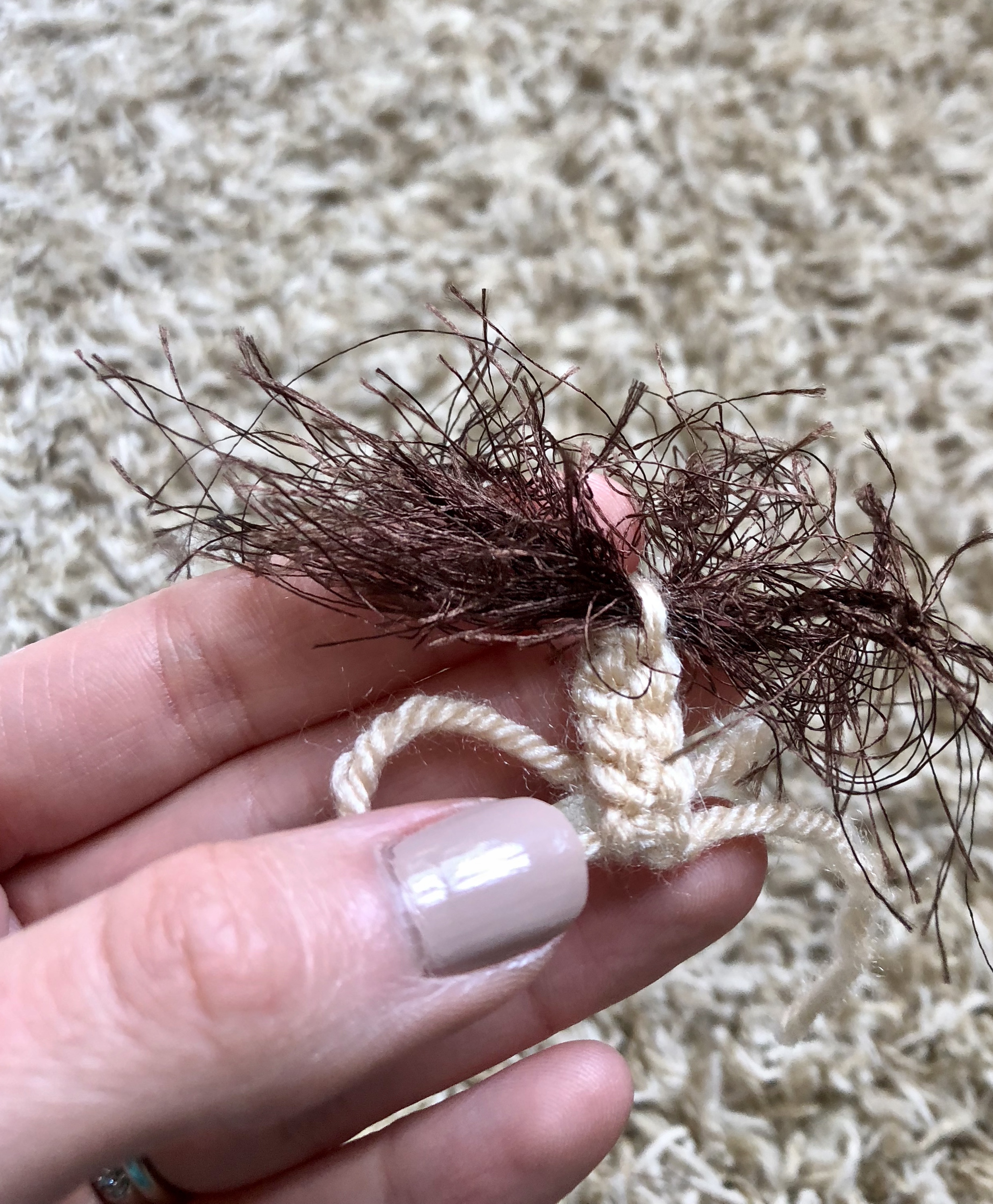 Row 2: sc 5, fasten off. Pull some brown embroidery floss or strands of eyelash yarn through the turning ch at the end and tie in place. Trim the eyelash yarn to your liking.