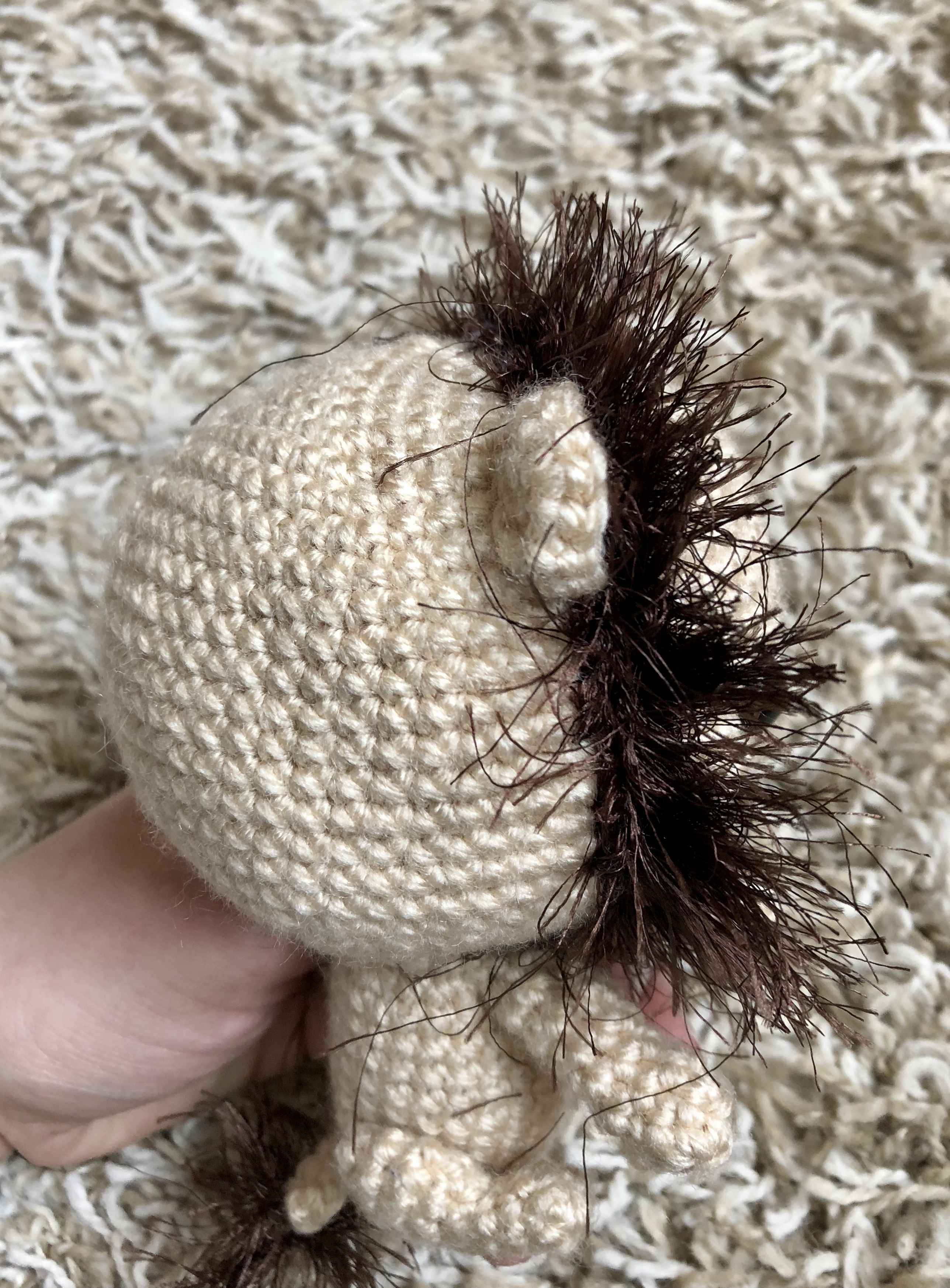 After fastening off the eyelash yarn, I used a dog slicker brush to brush out the mane. This will help grab up any fibers that might be trapped, and give a smoother and fuller look to the mane. I then gave him a nice haircut and trimmed the mane so that it was all an even length.
