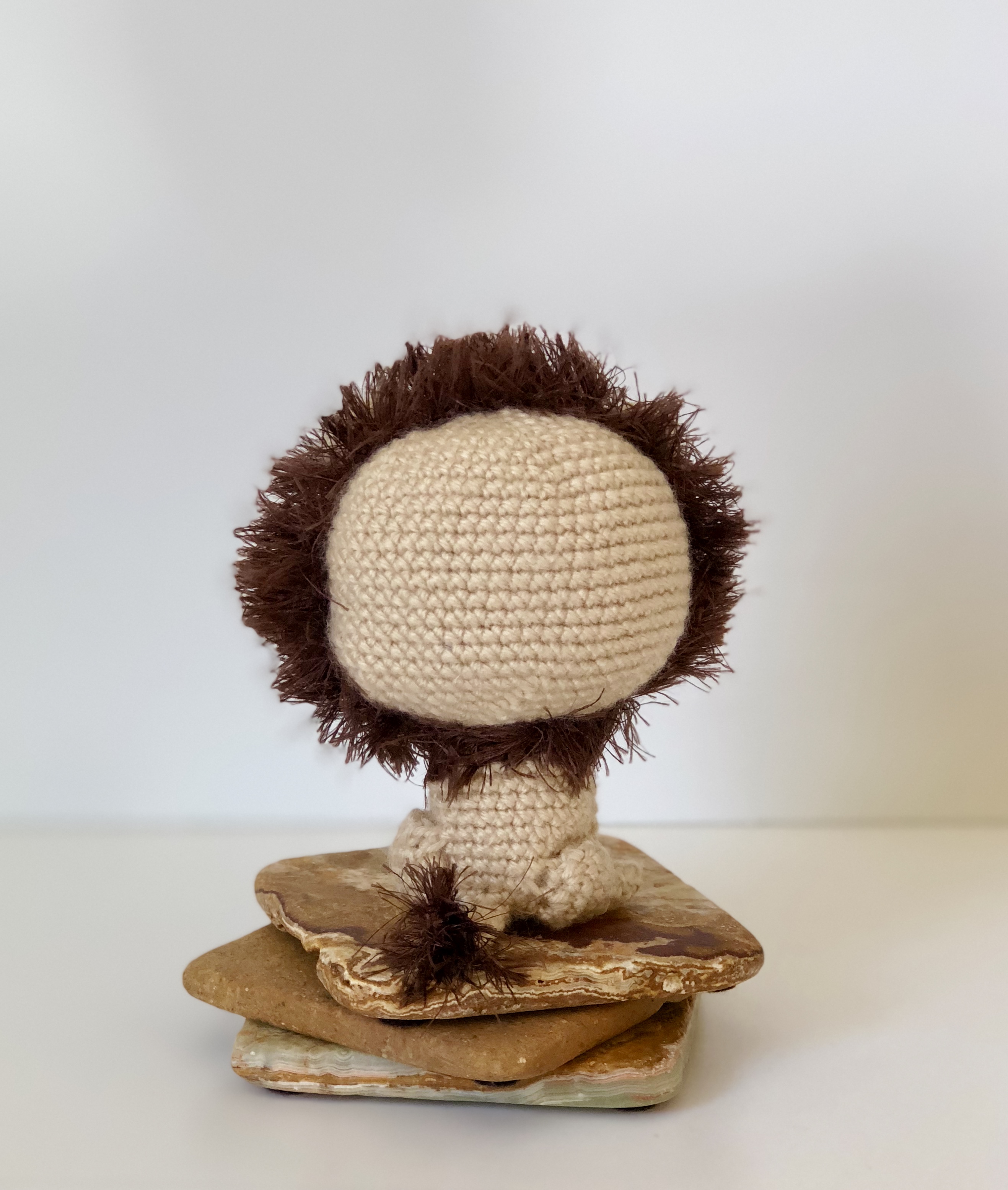I worked 4 rounds of eyelash yarn around but you could certainly keep going if you want the whole back of the head to be covered in the mane.