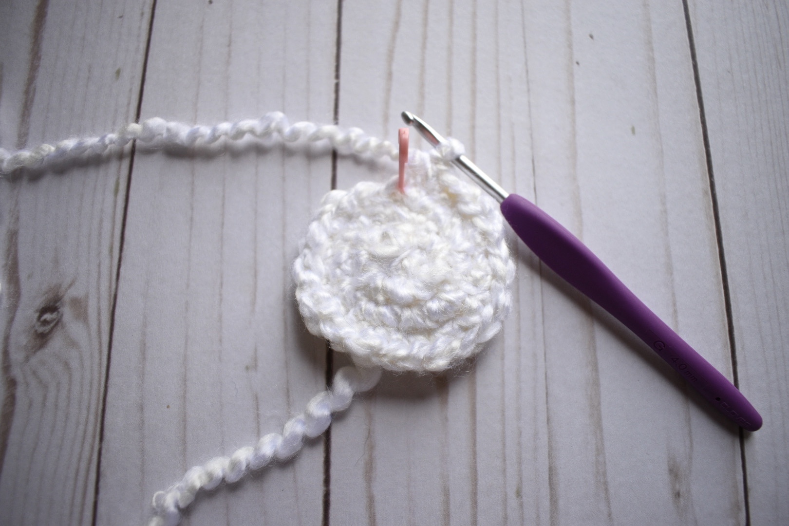 From here, you will switch to the fluffy white yarn. This style yarn can be a little challenging to work with because you have to feel for the stitches rather than see them, but it also does a really good job of hiding any imperfections, so as long as your count is correct for each round, theres no need to sweat it too much.