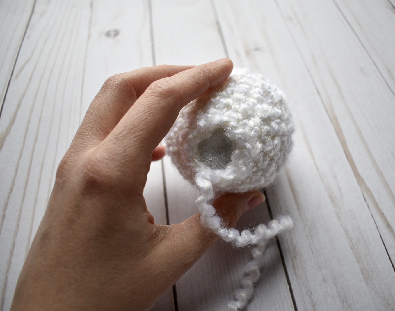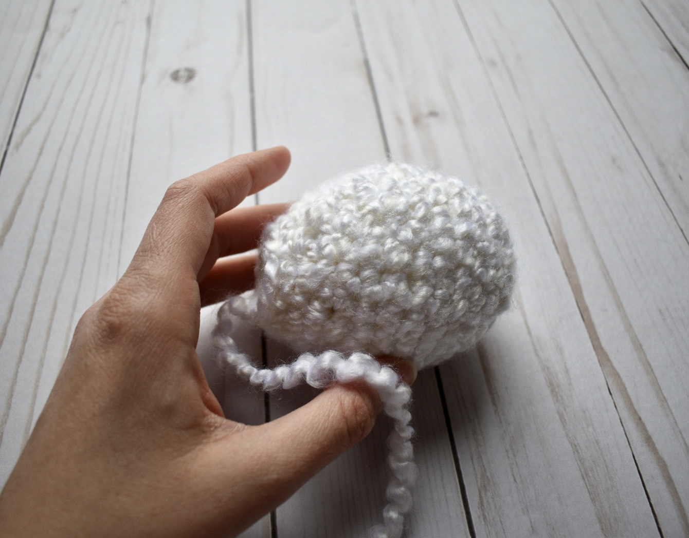 The last required part to crochet is the tail, which is just a small ball in the fluffy white yarn. Again, it starts in the magic ring, but there are just 2 rounds after that, then you’ll fasten off leaving a tail for assembly. I did not stuff my tail, as it doesn’t really need it with how fluffy the yarn is.