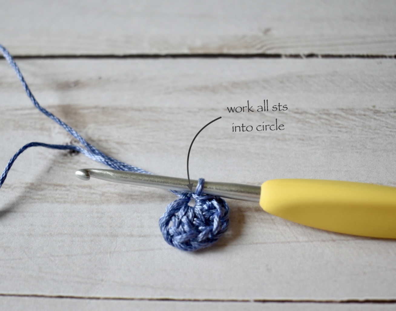 The large flower will be worked into the stitches of a magic ring, but the same idea applies.