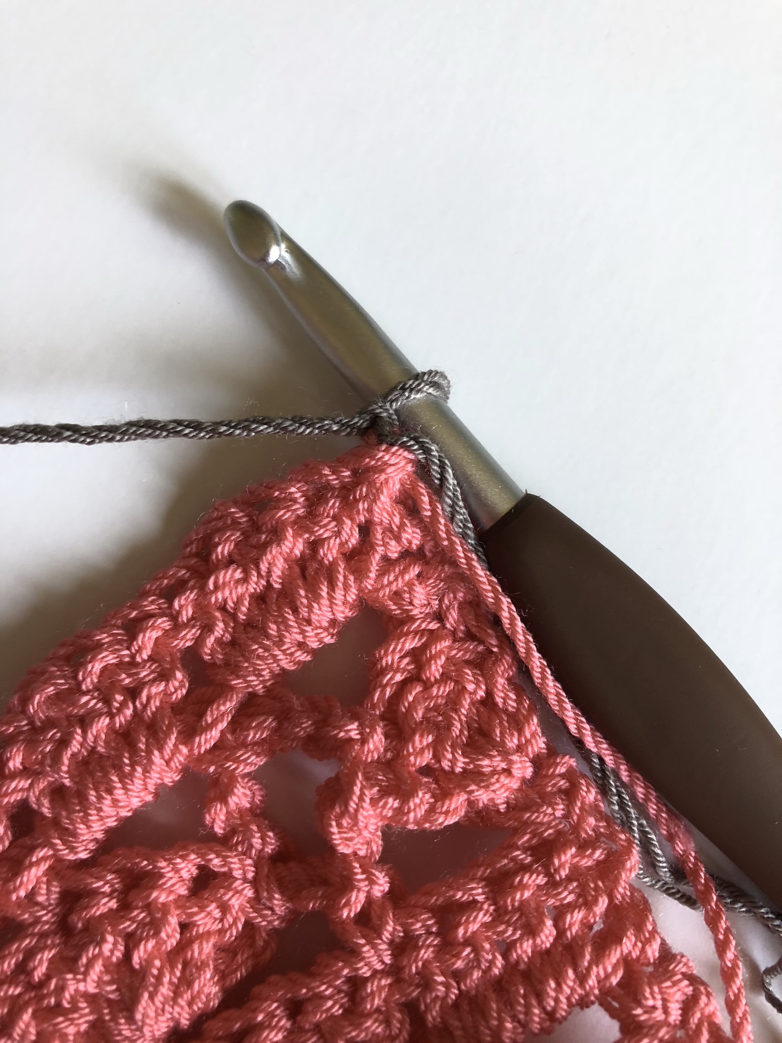 Once you are almost to the top of your dress, you will end on the double crochet 4 row (step 3) of your Mesh & Shells stitch. Then you’ll switch over to your taupe color, and switch to an open mesh stitch.