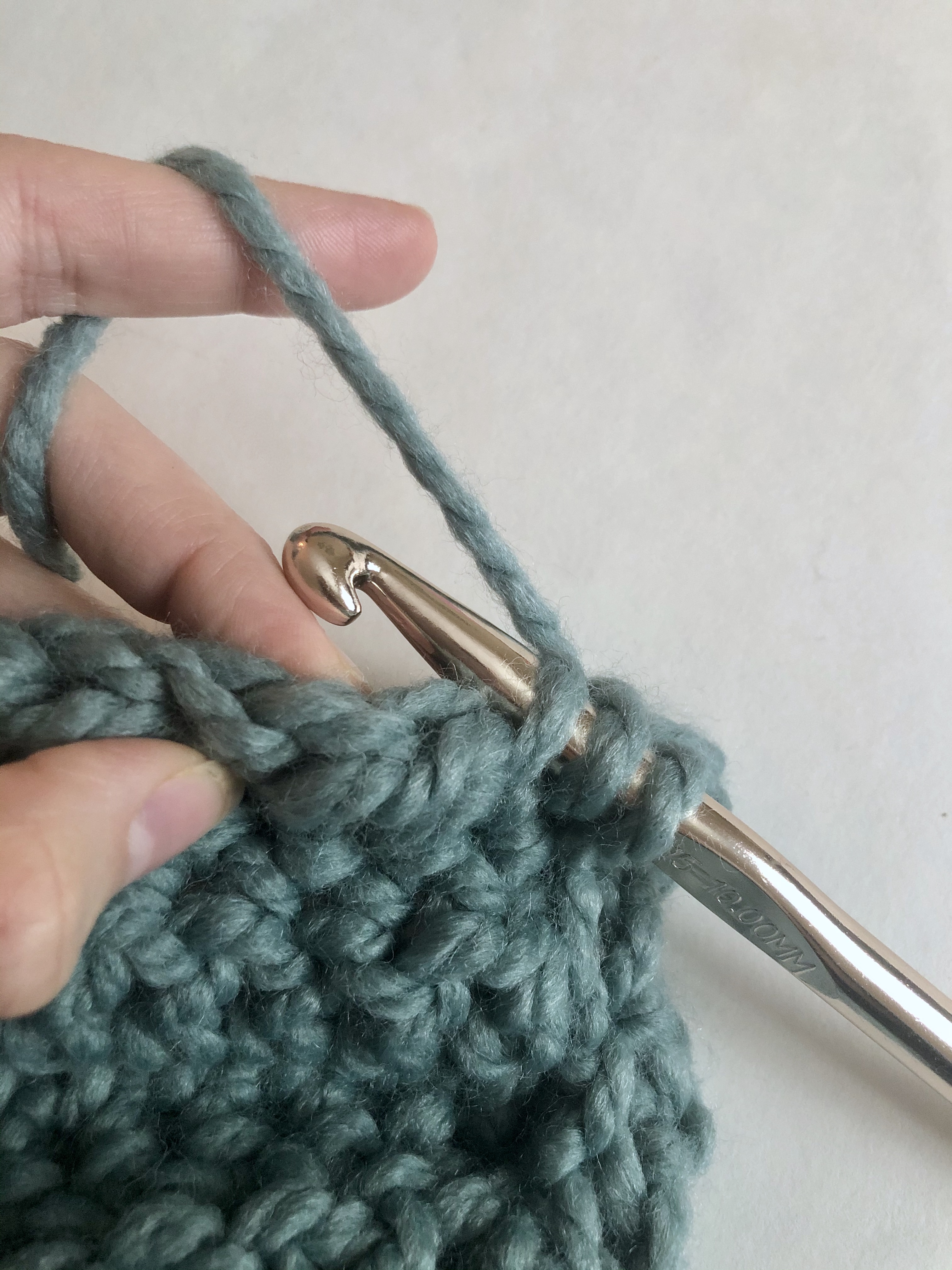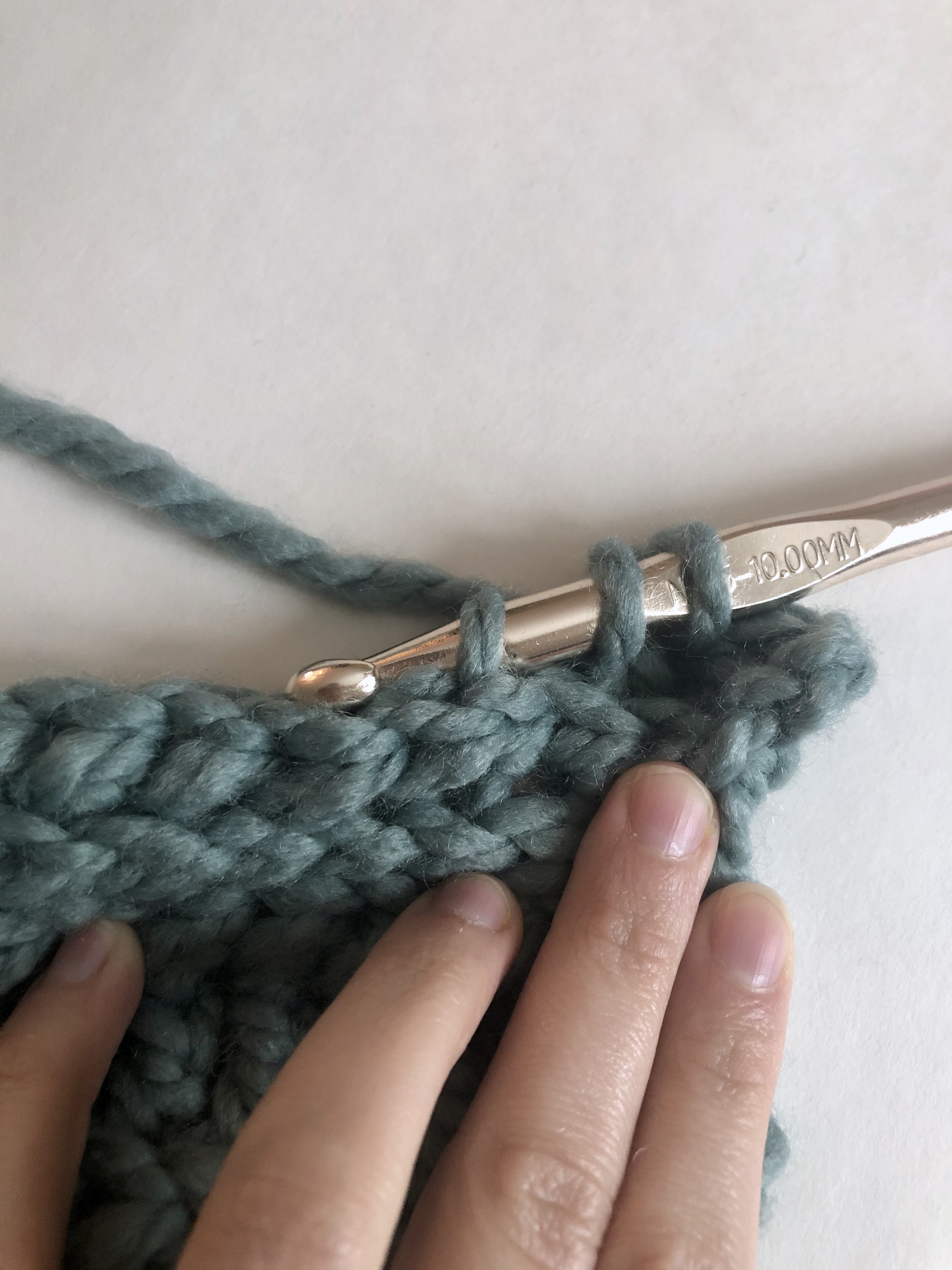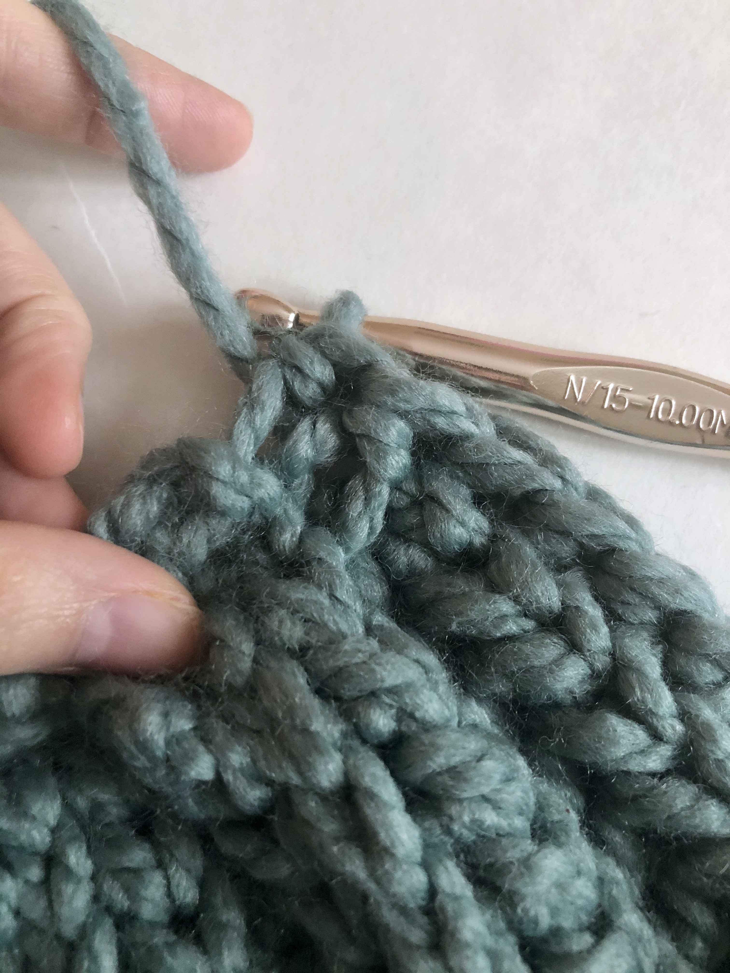 In the next row, you will start to work the knit-looking half double crochet slip stitches.