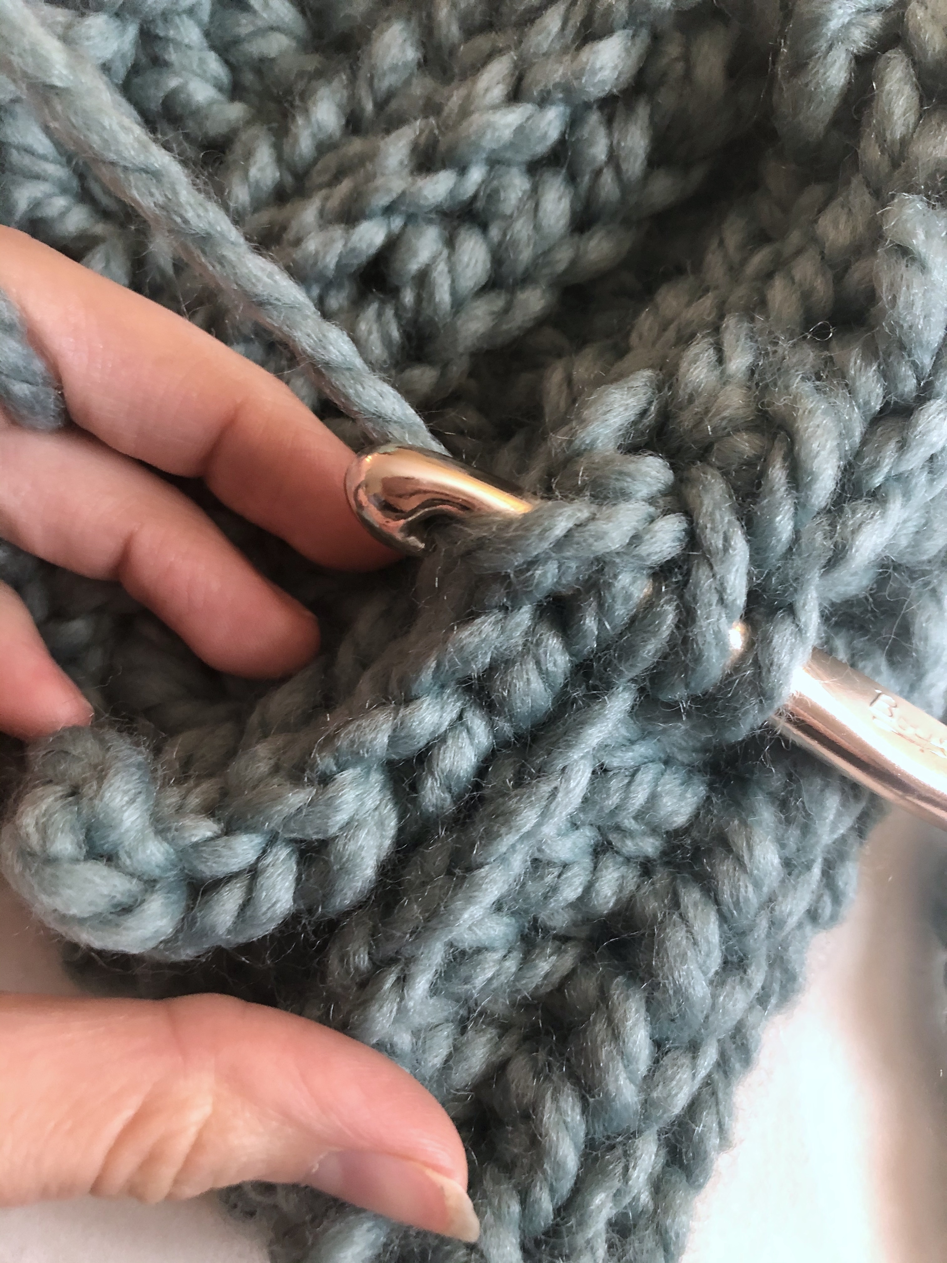While working this row of slip stitches, you will want to place one slip stitch into each row worked (you may also choose to work 2 slip stitches into the double crochet rows, if this feels more natural for you). It is important to work these slip stitches loosely, as they do not offer a lot of give.